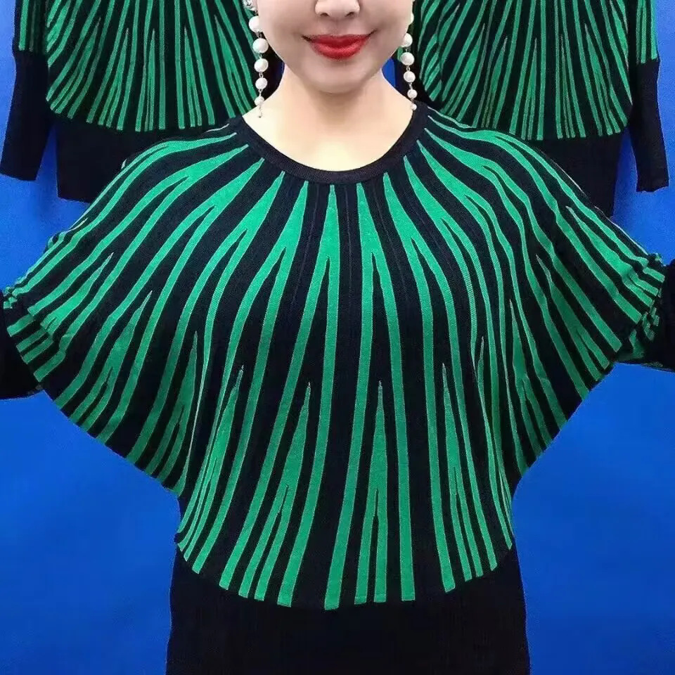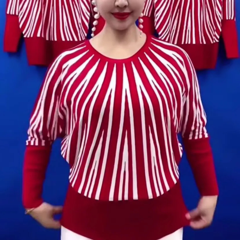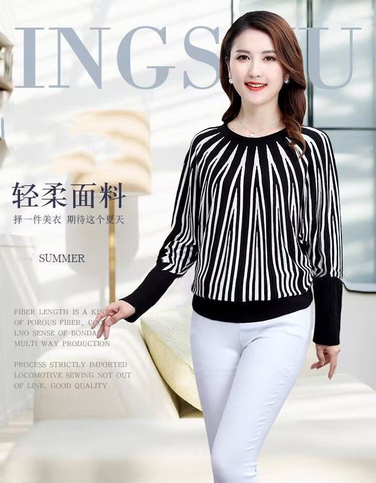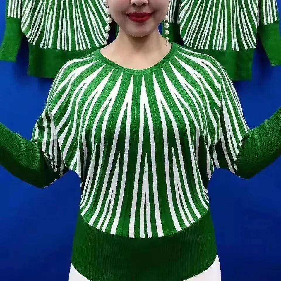 중년 및 노인 여성의 새로운 봄과 가을 탑을위한 기본 셔츠 줄무늬 노화 감소 느슨한 니트 셔츠 민족 스타일 티셔츠 배팅 셔츠