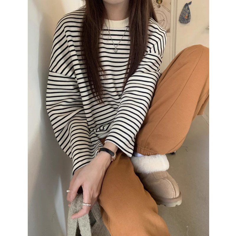2025 봄 새 줄무늬 크루 넥 스웨터 여성 내베이스 셔츠 느슨한 올 매치 게으른 스타일 탑