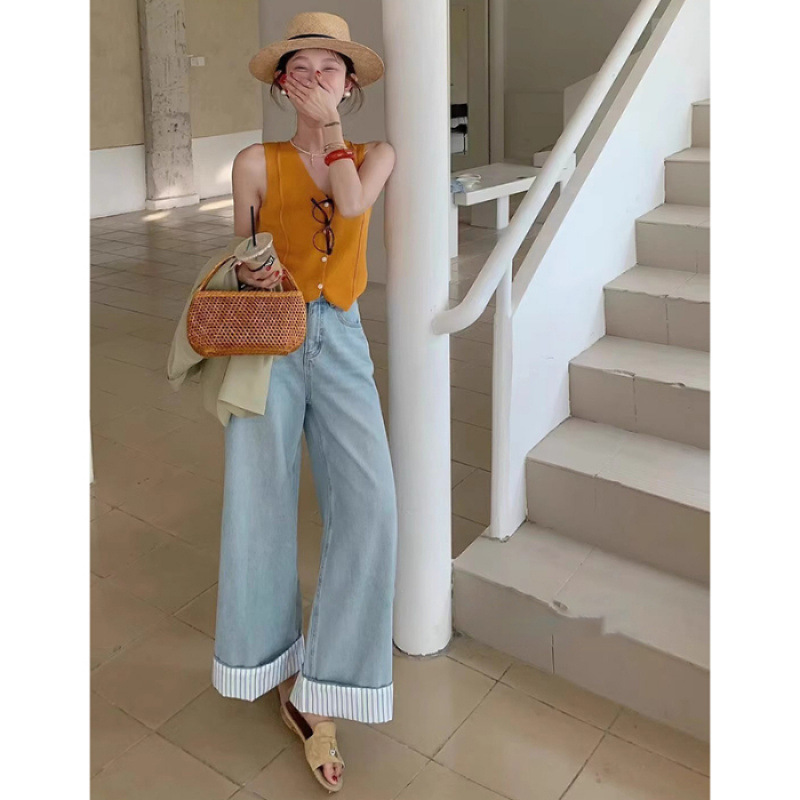 플랜지 스트라이프 바느질 넓은 다리 청바지 여성의 2025 년 봄과 여름 새로운 한국 스타일 느슨한 슬리밍 유행 스트레이트 다리 바지스토어 가기