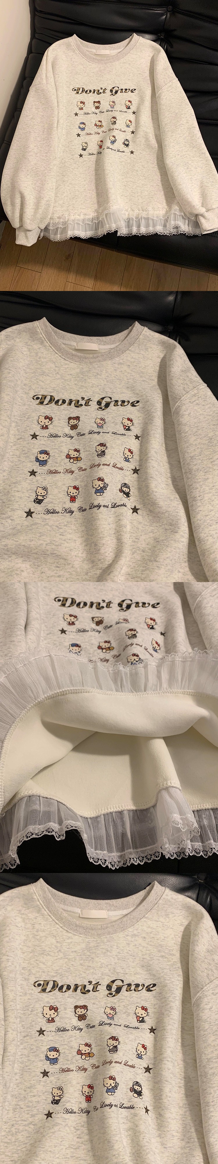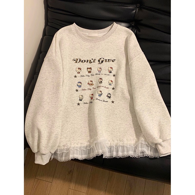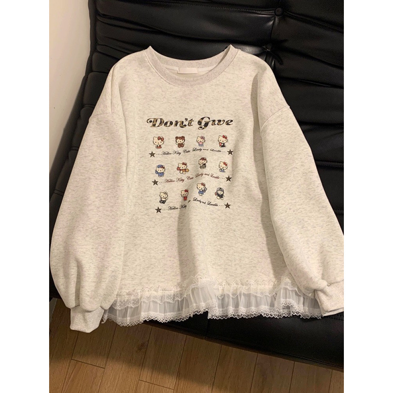 달콤한 2025 땀 여성 봄 레이스 바느질 새로운 KT 인쇄 크루 넥 디자인 감각 외부 후드 탑스토어 가기