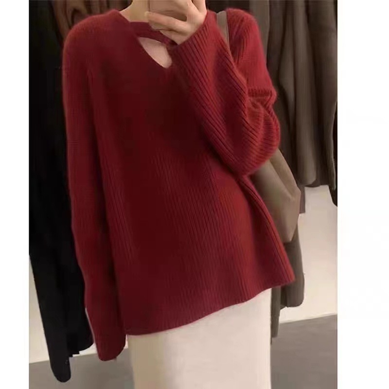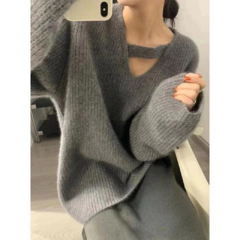 그레이 칼라 할로우 아웃 긴팔 니트 스웨터 여성의 가을 및 겨울 디자인 센스 니쉬 의상 슬림 핏 슬림 게으른 탑스토어 가기