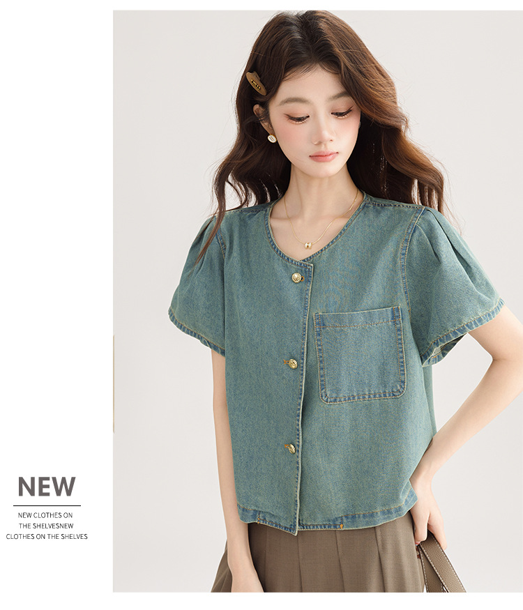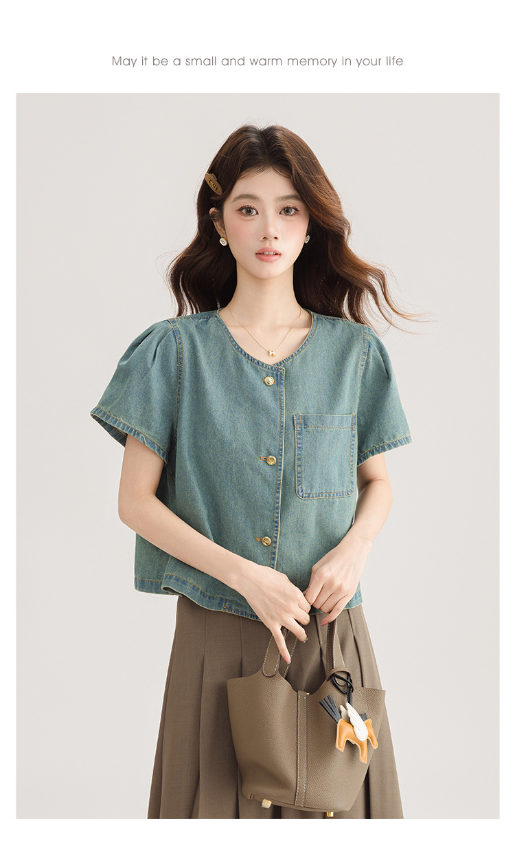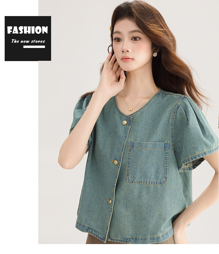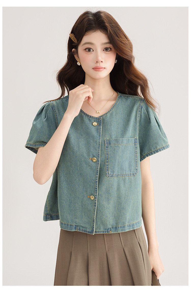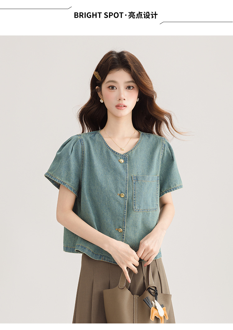 2025 년 여름 새 한국 패션 반팔 데님 셔츠 여성 작은 디자인 센스 퍼프 소매 데님 옷스토어 가기