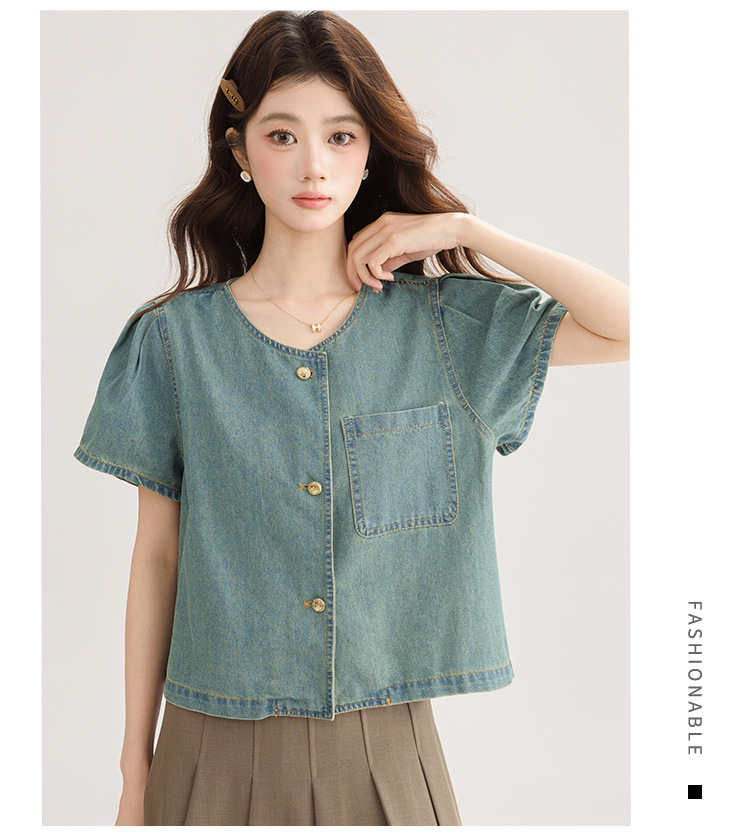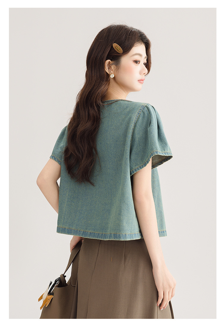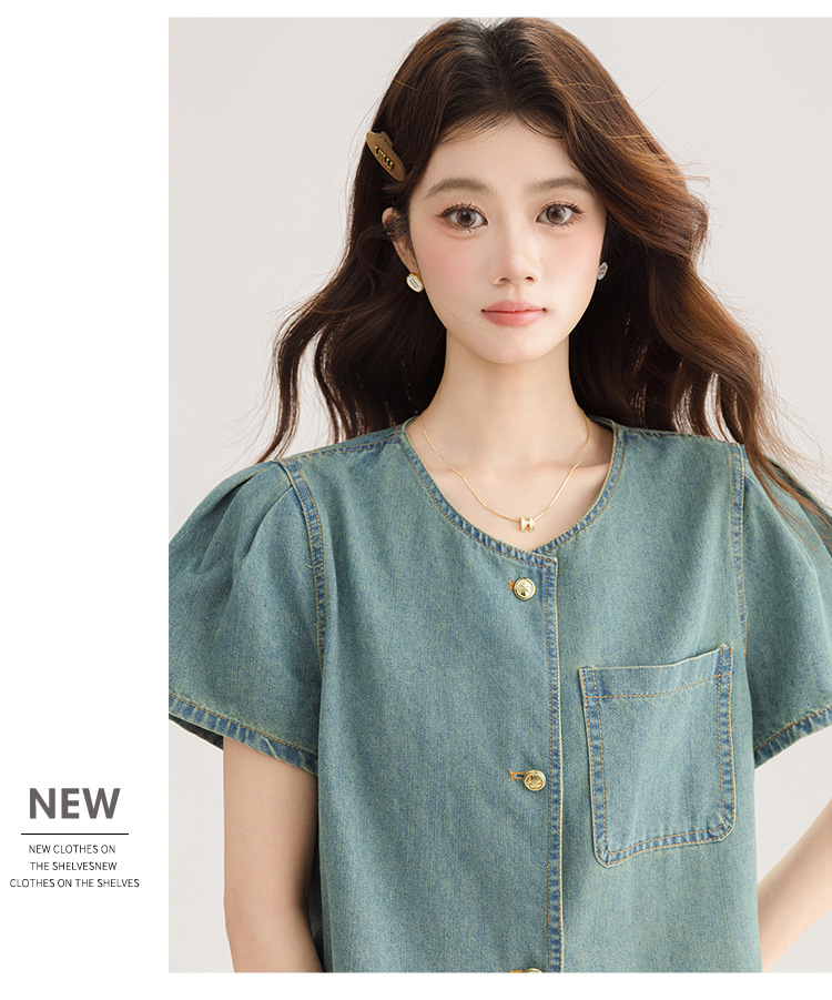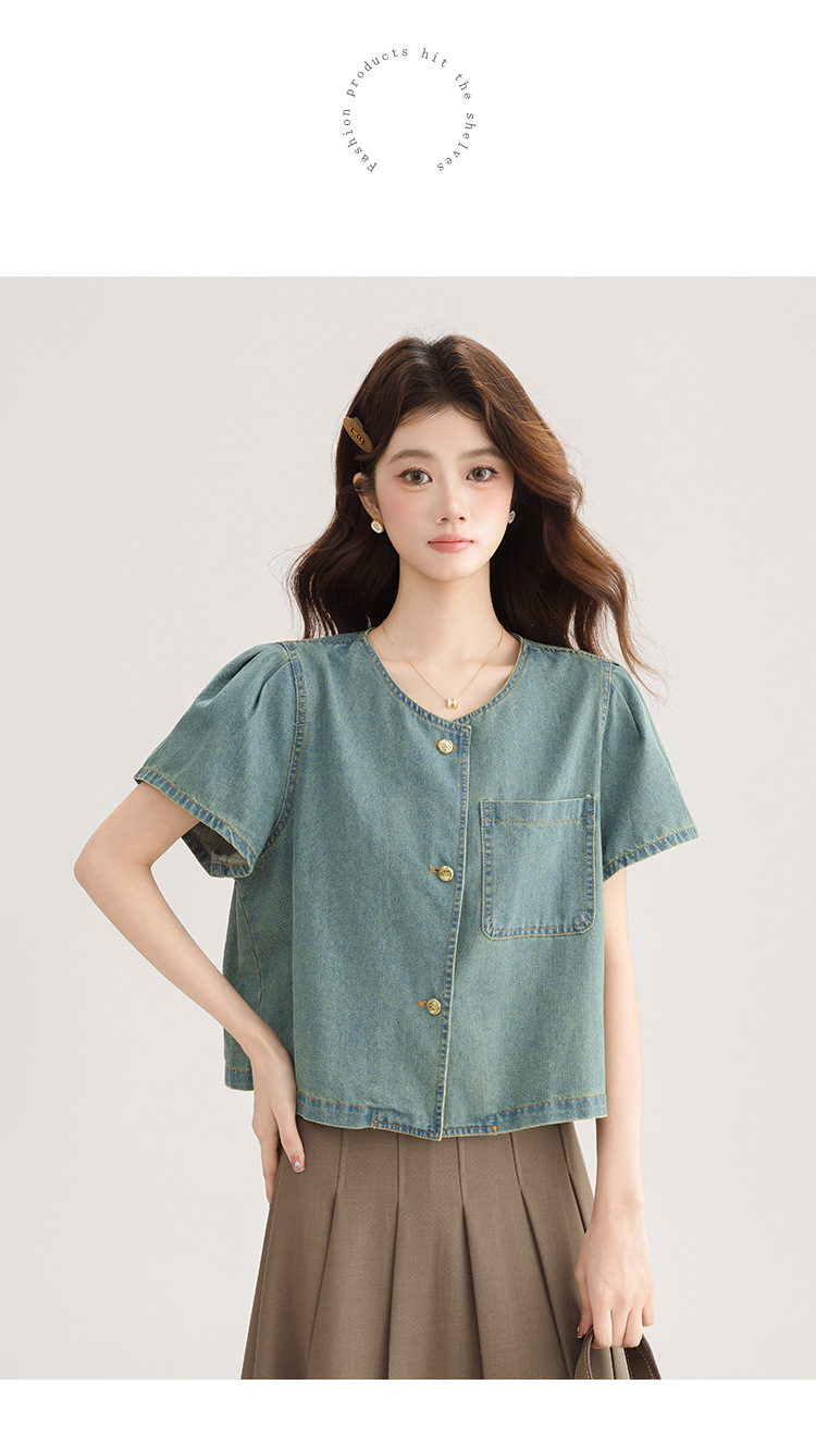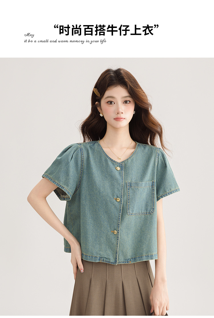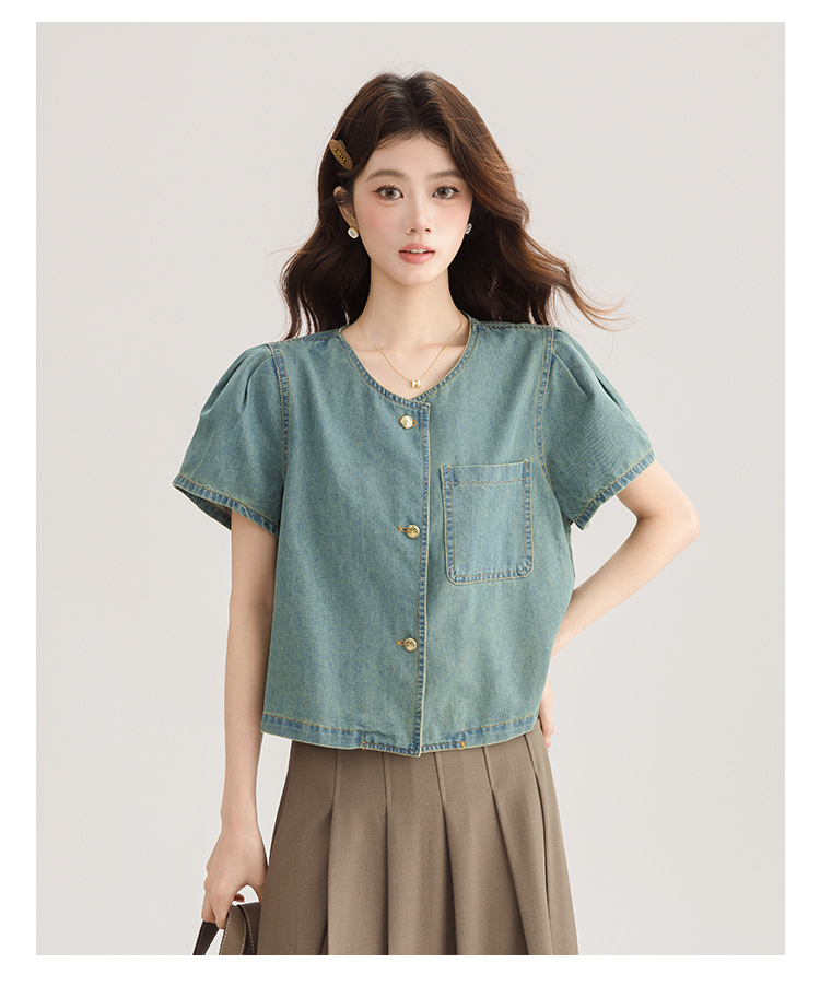 2025 년 여름 새 한국 패션 반팔 데님 셔츠 여성 작은 디자인 센스 퍼프 소매 데님 옷스토어 가기