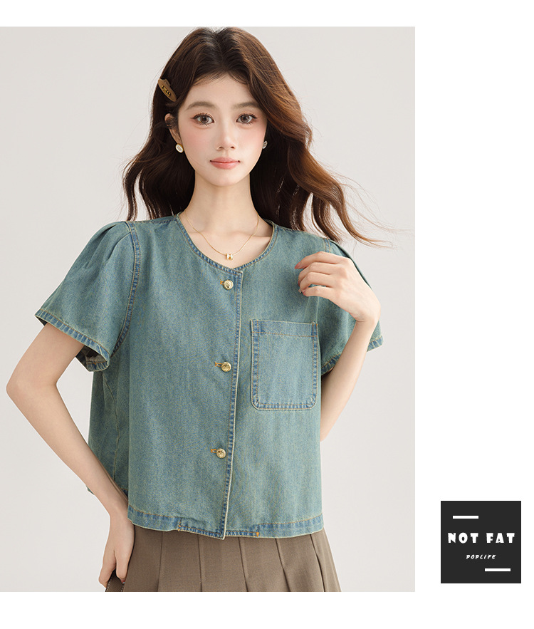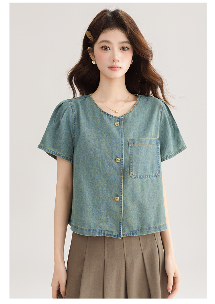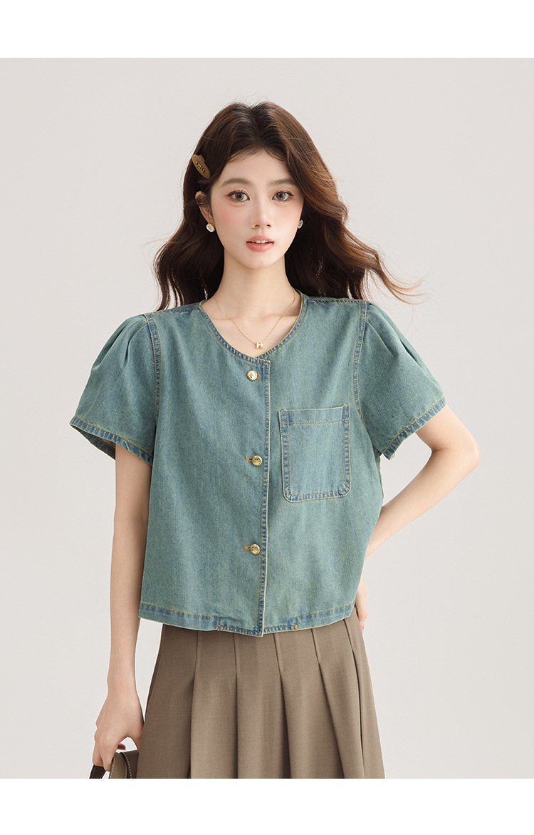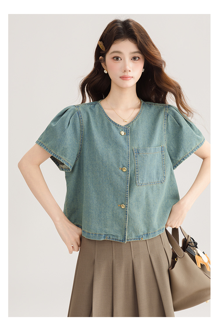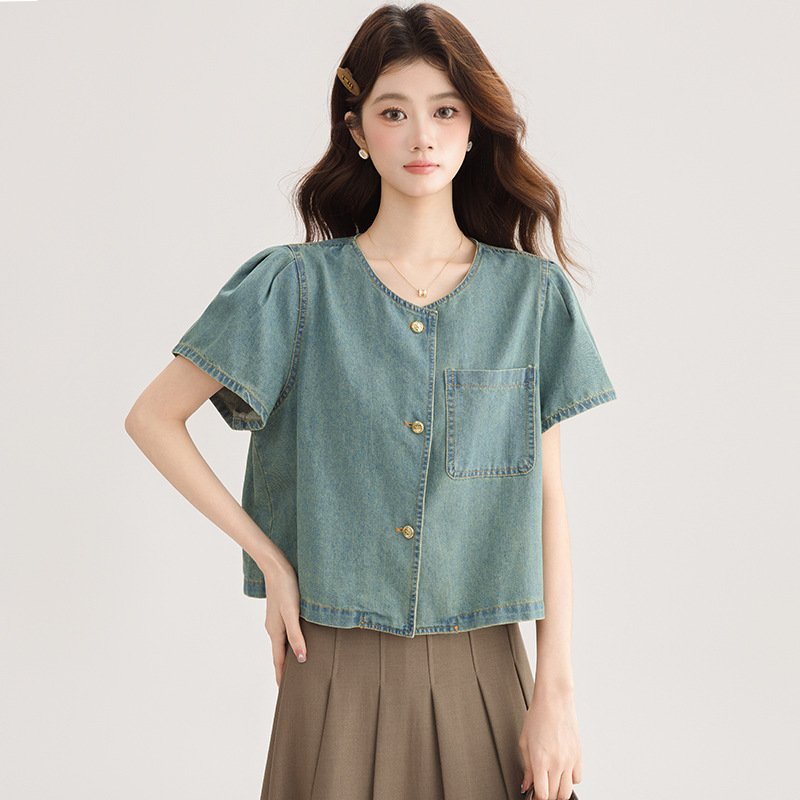 2025 년 여름 새 한국 패션 반팔 데님 셔츠 여성 작은 디자인 센스 퍼프 소매 데님 옷