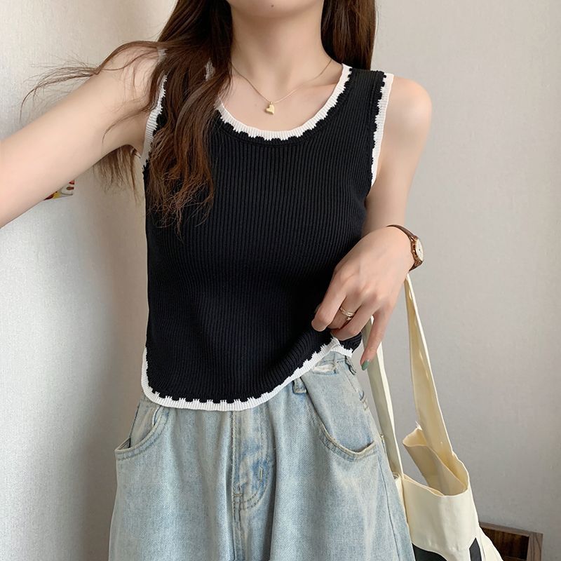 화이트 카미 솔 여름 2025 새로운 스파이스 걸스 민소매 대조 쇼트 탑 니트 아우터 웨어 스택 탑스토어 가기