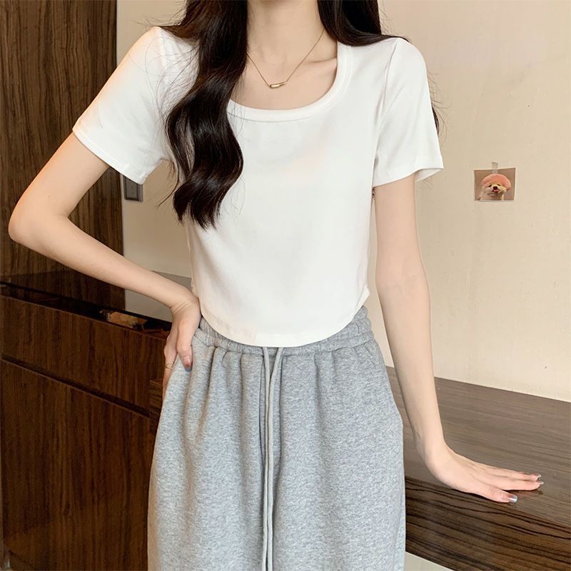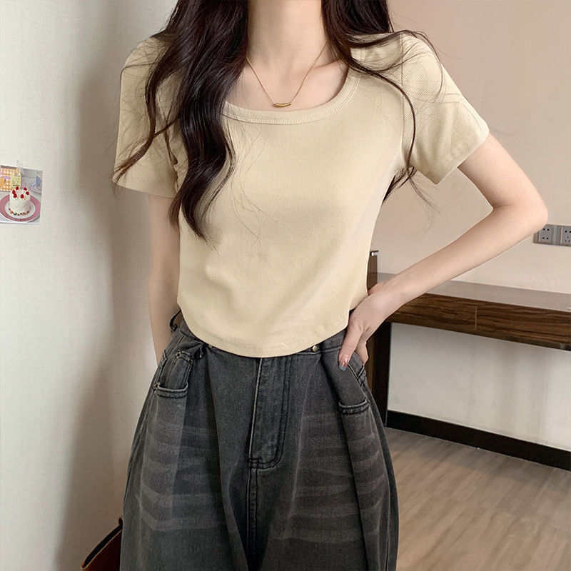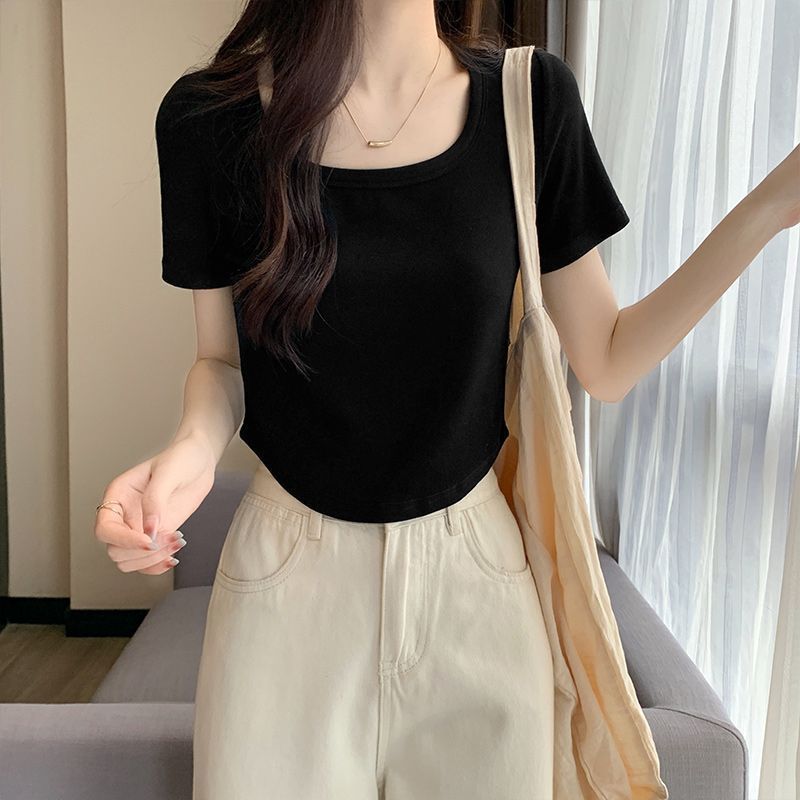순수한 욕망 스타일 올 매치 U-넥 반팔 티셔츠 여자 2025 년 새 여름 불규칙한 헴 슬림 룩 쇼트 탑스토어 가기