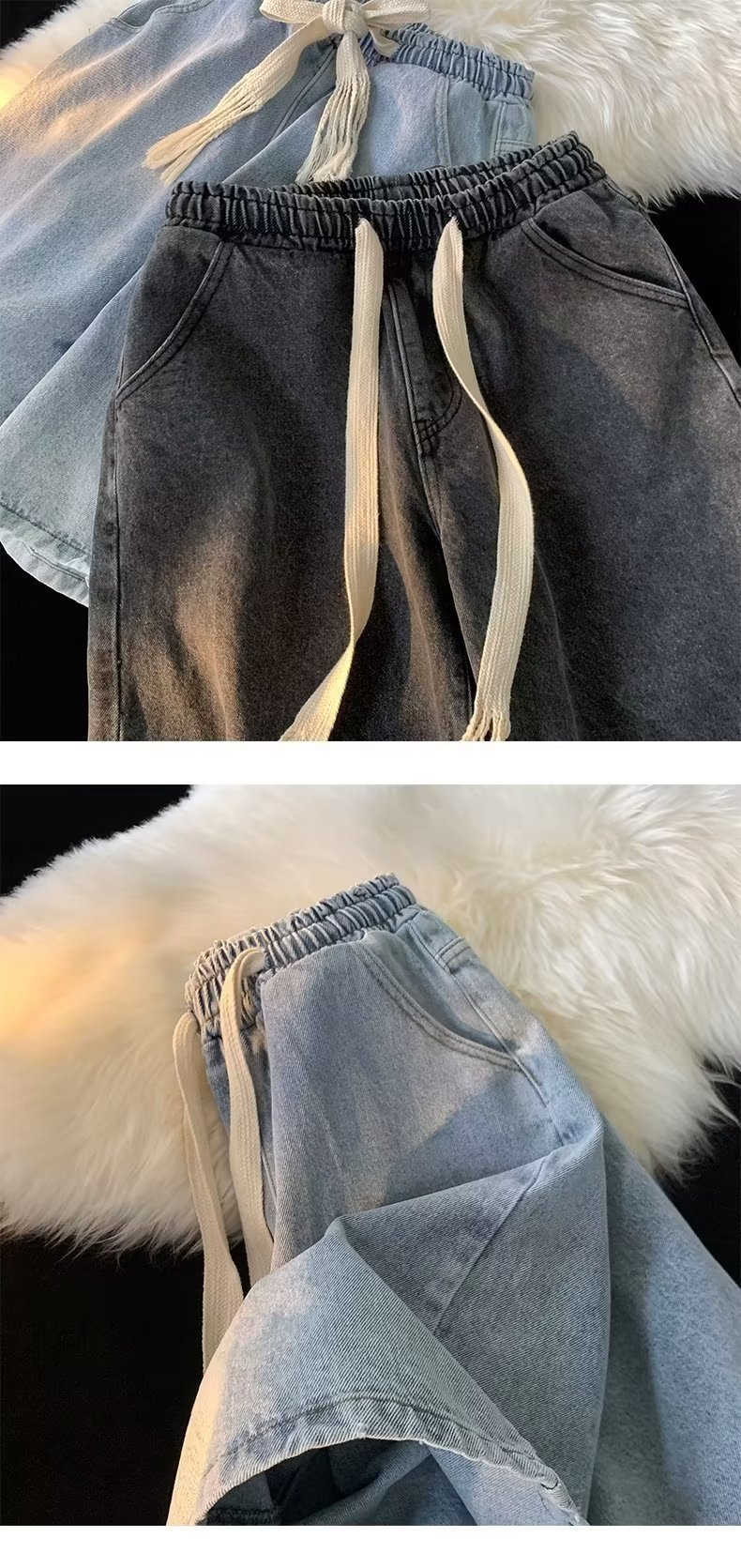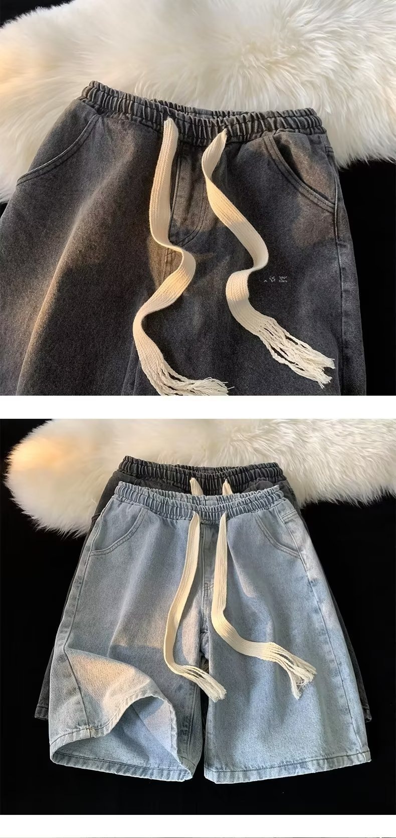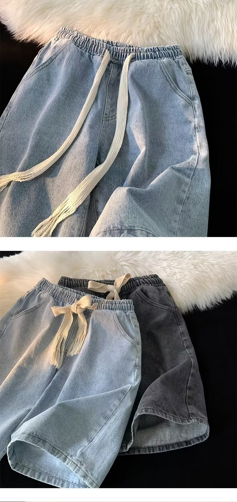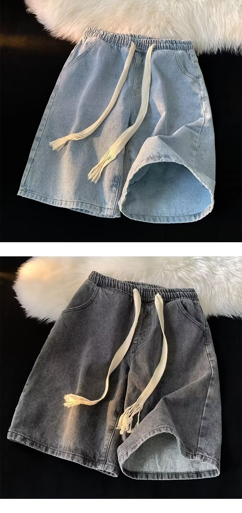 드로우 스트링 데님 반바지 남성 여름 얇은 트렌디 브랜드 캐주얼 바지 미국 스타일 레트로 스트레이트 루즈 플러스 사이즈 반바지