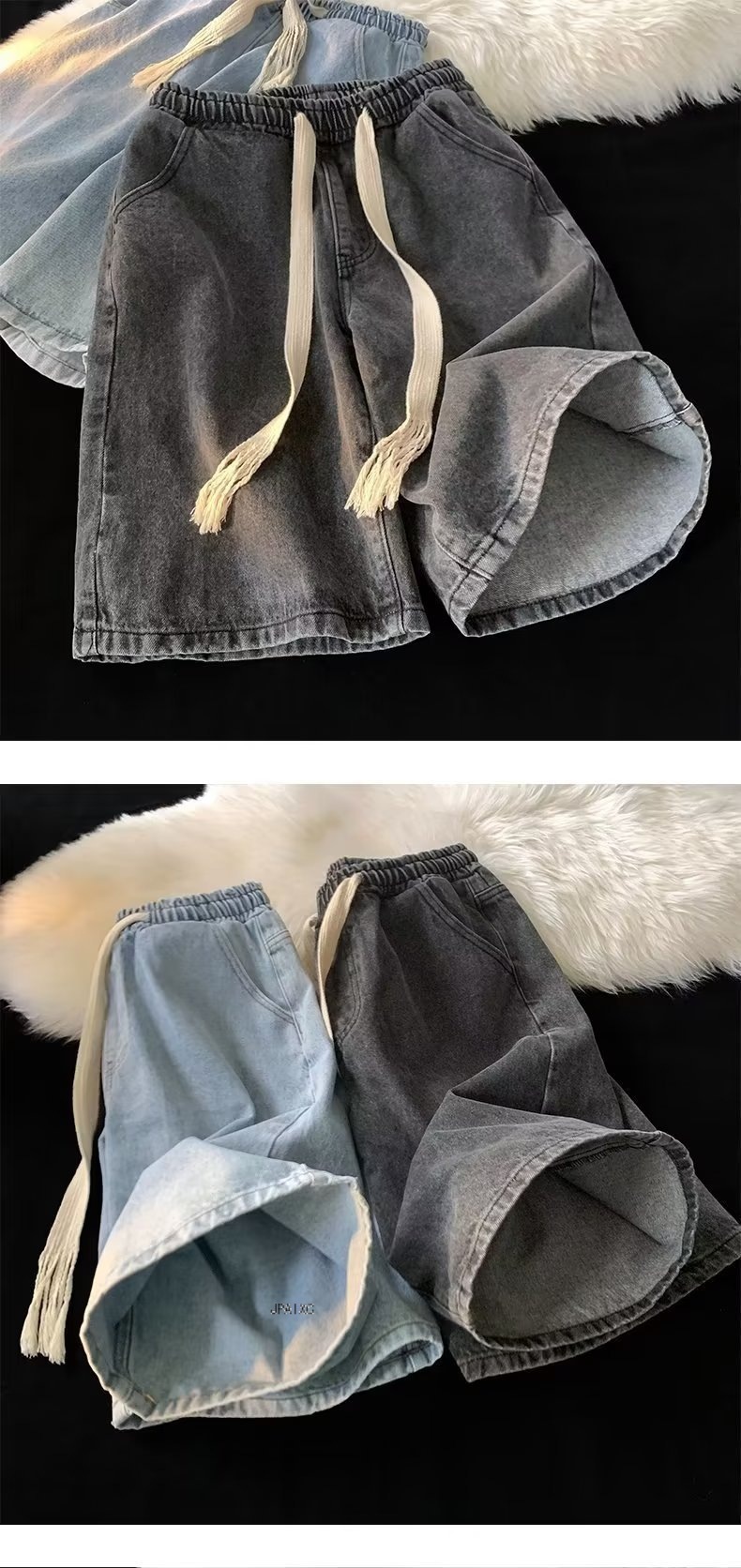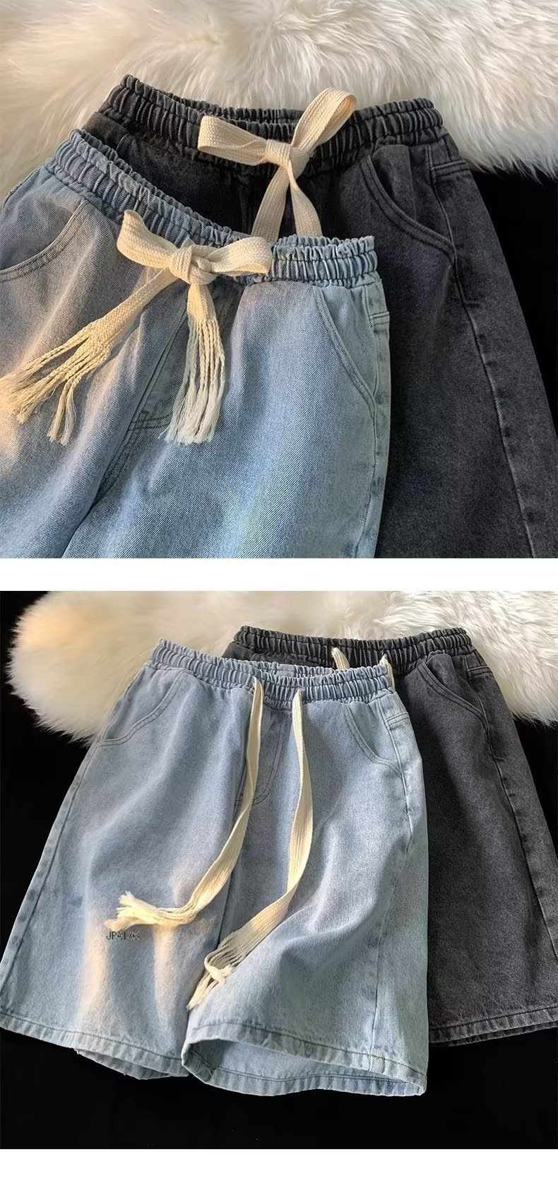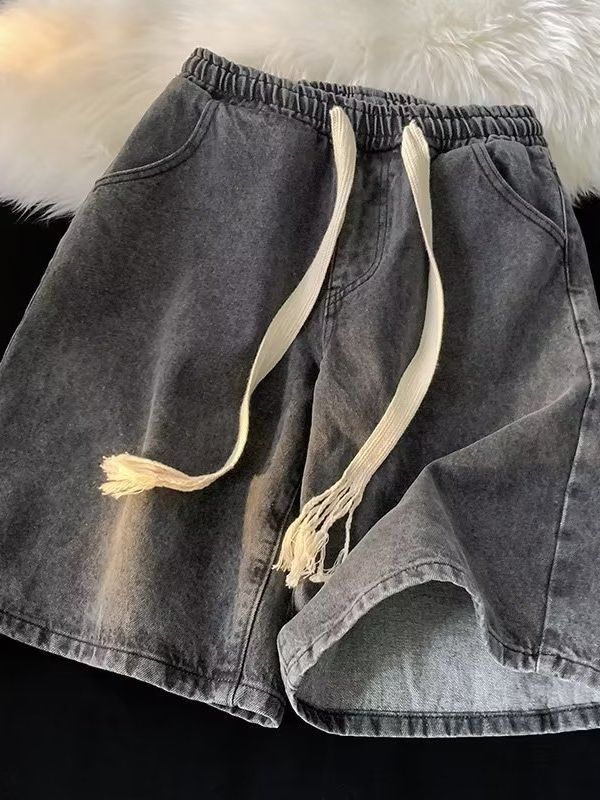 드로우 스트링 데님 반바지 남성 여름 얇은 트렌디 브랜드 캐주얼 바지 미국 스타일 레트로 스트레이트 루즈 플러스 사이즈 반바지스토어 가기