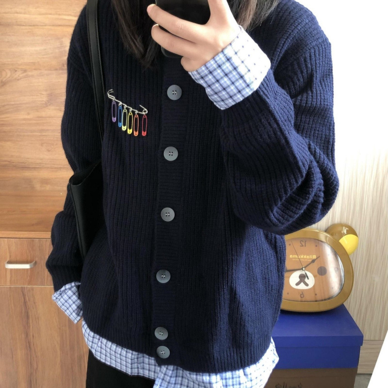 디자인 센스 바느질 가짜 투피스 니트웨어 가을 코트 고급 가을 겨울 스웨터 카디건 올 매치 트렌디