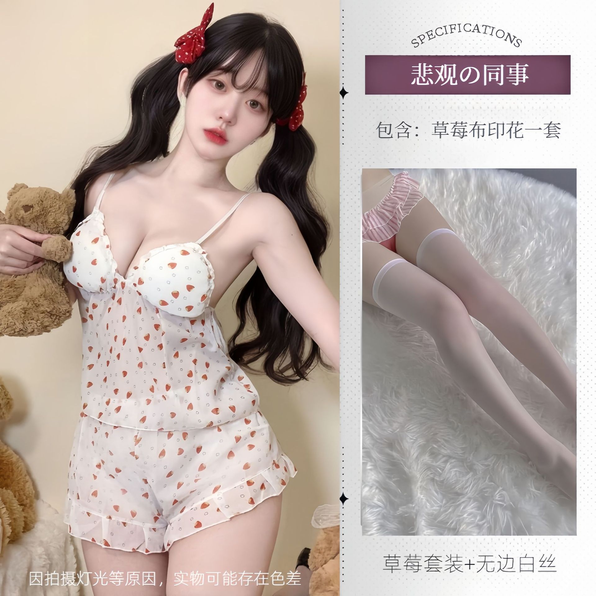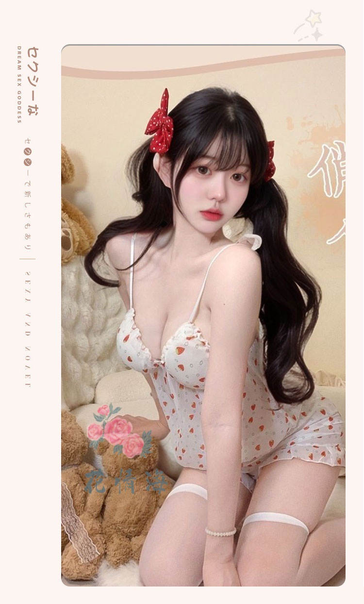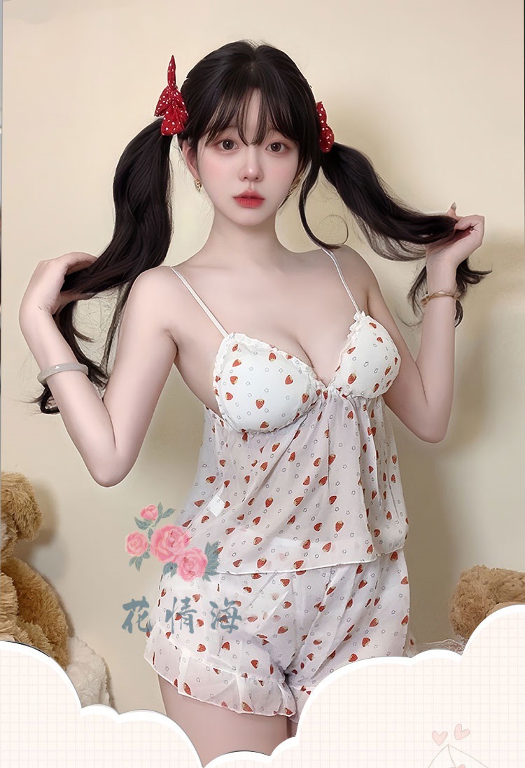 • A868 딸기 프린트 슈트 + 테두리 없는 화이트 실크
