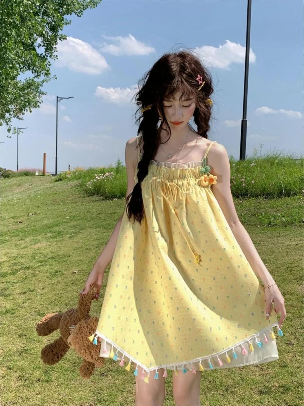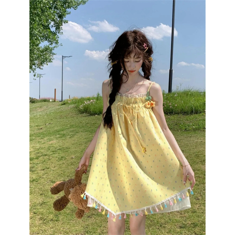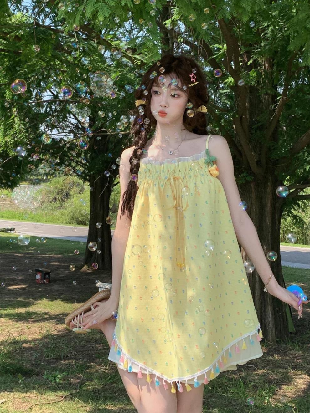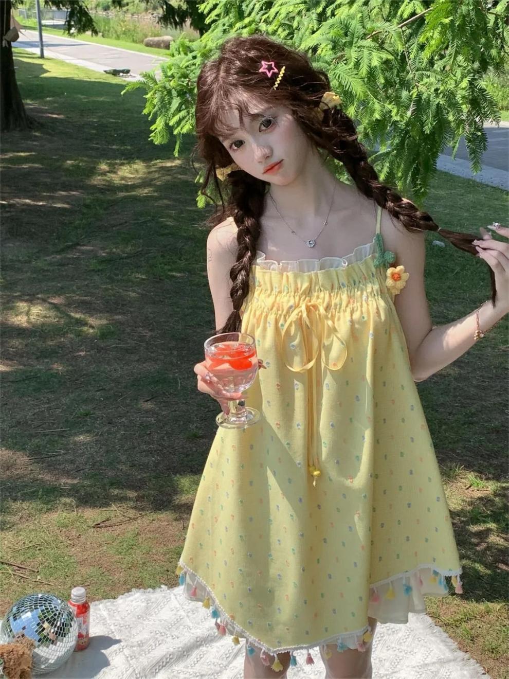 귀엽고 달콤한 컬러 웨이브 도트 슬링 원피스 여성의 여름 짧은 나이 감소 느슨한 슈퍼 니스 술 스커트