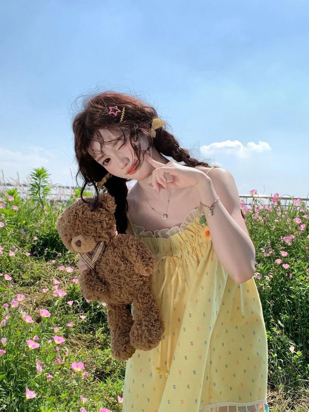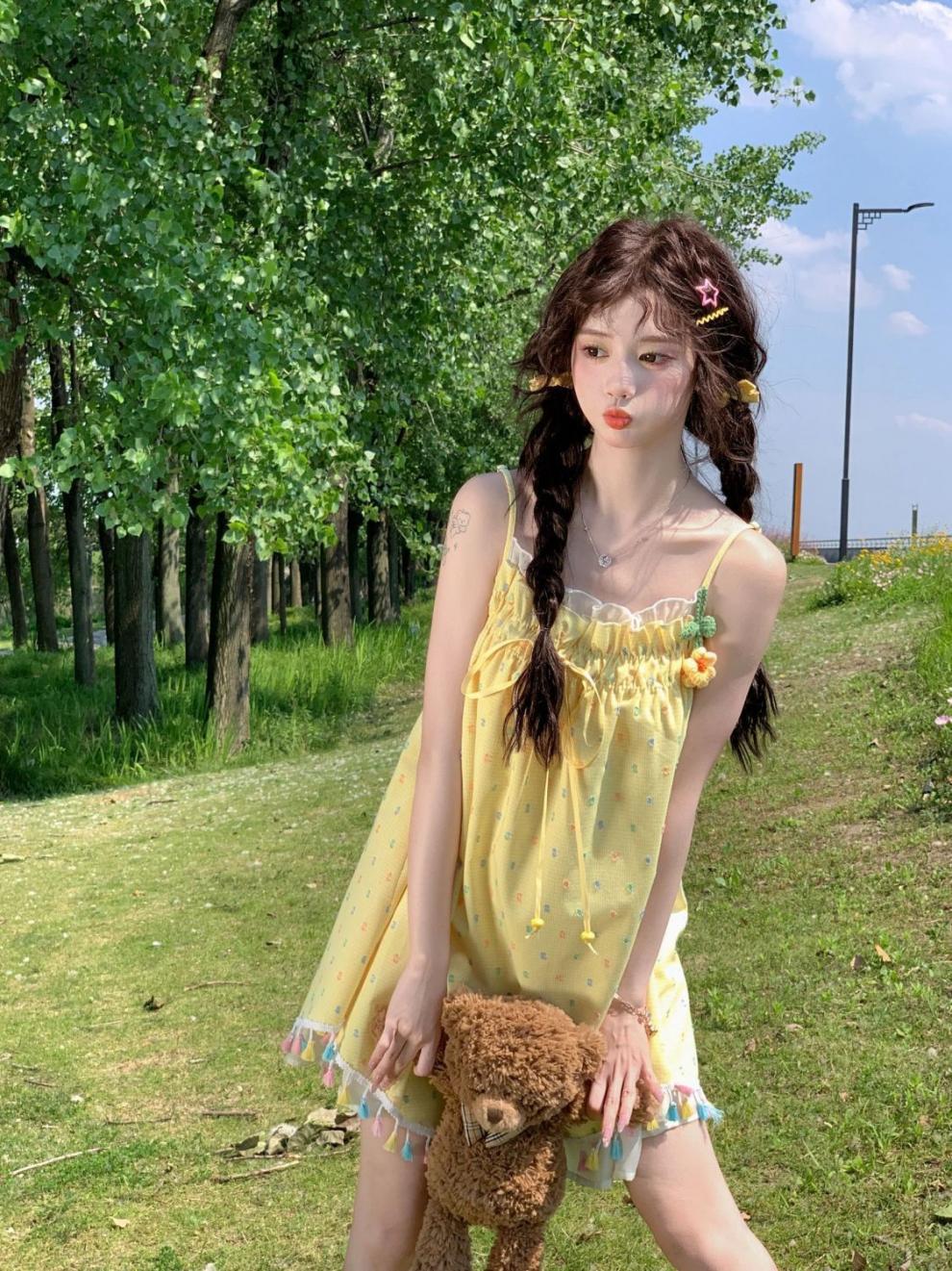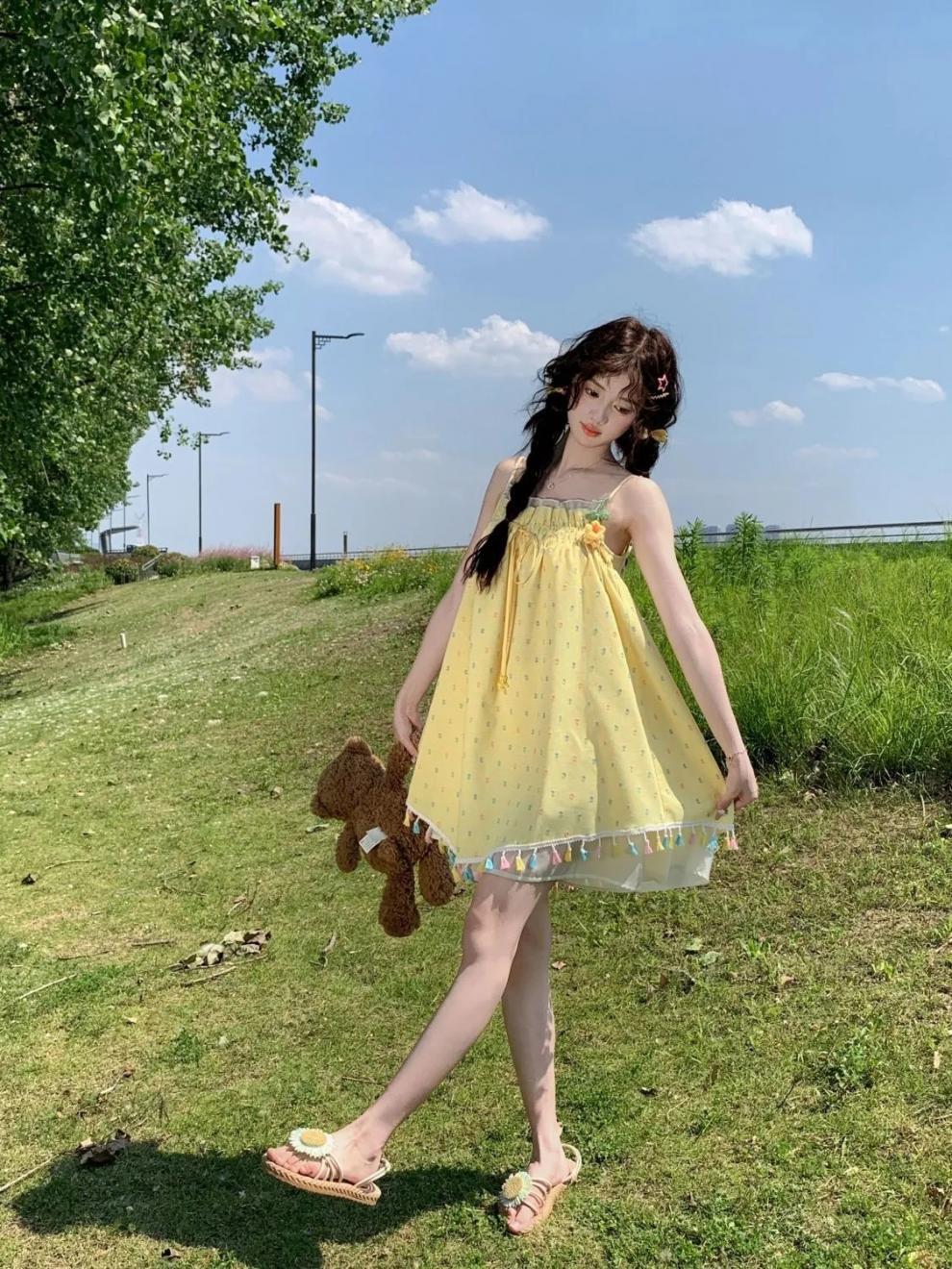 귀엽고 달콤한 컬러 웨이브 도트 슬링 원피스 여성의 여름 짧은 나이 감소 느슨한 슈퍼 니스 술 스커트