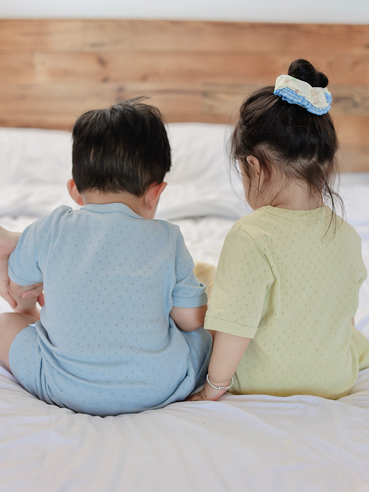 2025 여름 소년 소녀를위한 새로운 어린이 단색 호흡 잠옷 아기 면 클래스 A 한국 홈 의류 세트