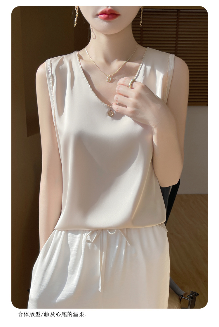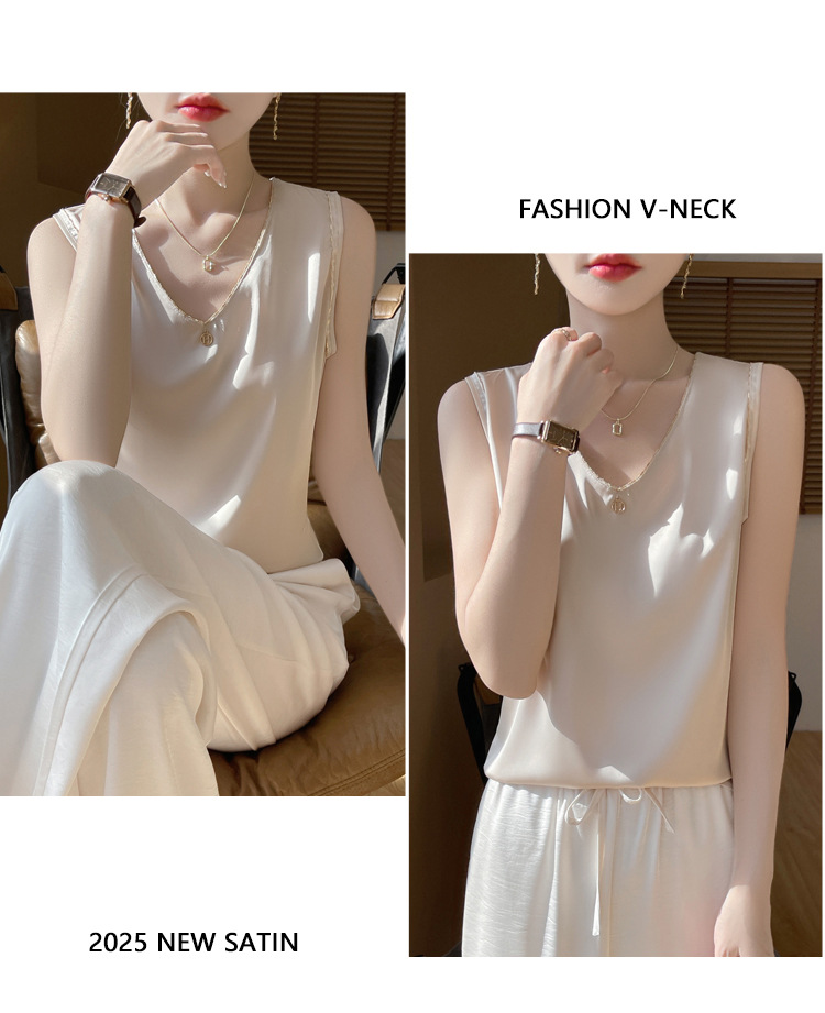 2025 년 여름 새로운 민소매 조끼 사틴베이스 스트랩 탑 공장 공급과 여성 V 넥 세트