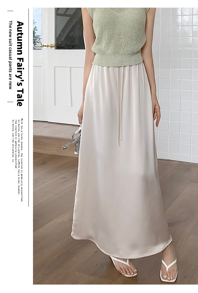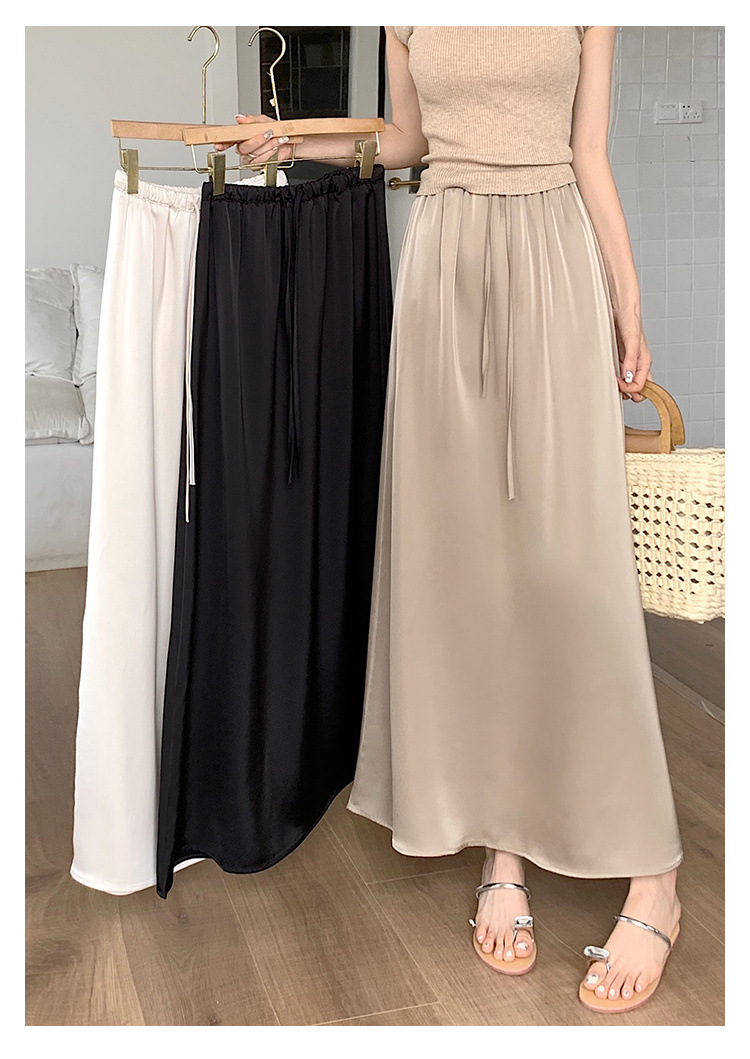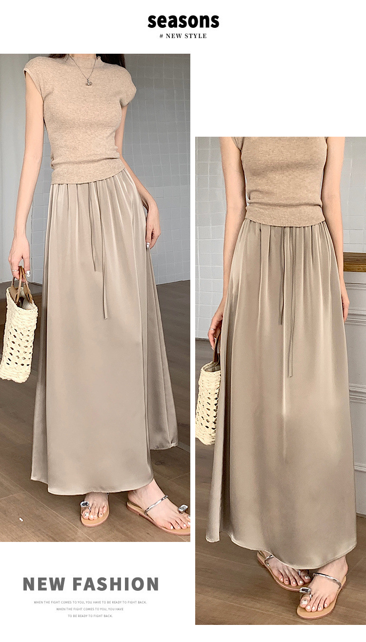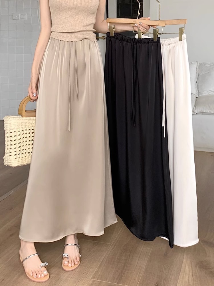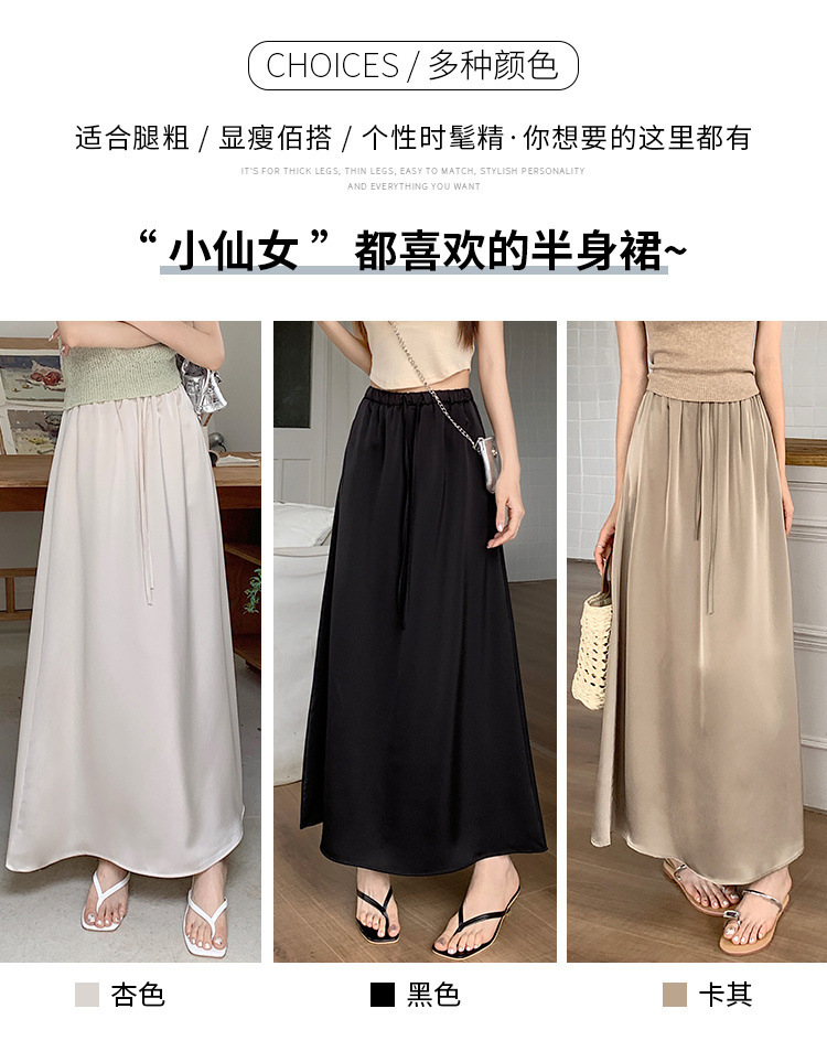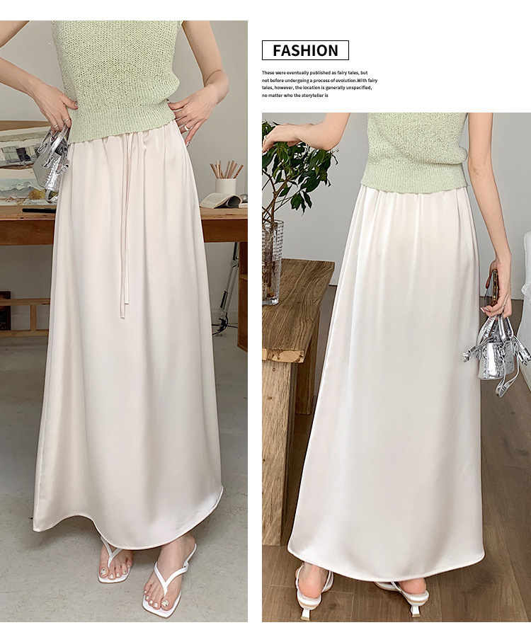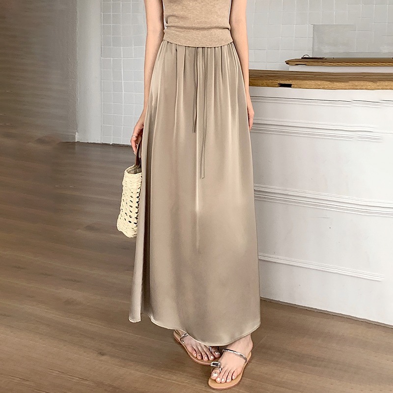고급 Acetic Acid Satin 치마 여성 여름 중간 길이의 높은 허리 슬리밍 교수형 스타일 우아한 대형 치마