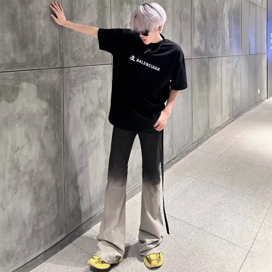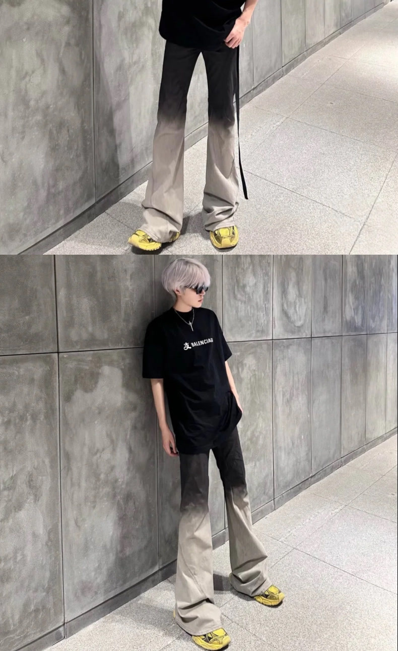 미국식 하이 스트리트 워시 그라디언트 스트림 마이크로 플레어 진 남성 올 매치 스택 레그는 긴 슬림 핏 스트레이트 팬츠를 보여줍니다.
