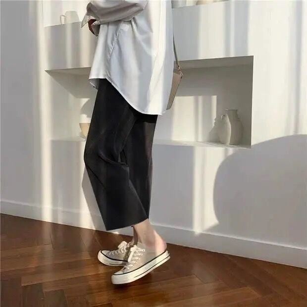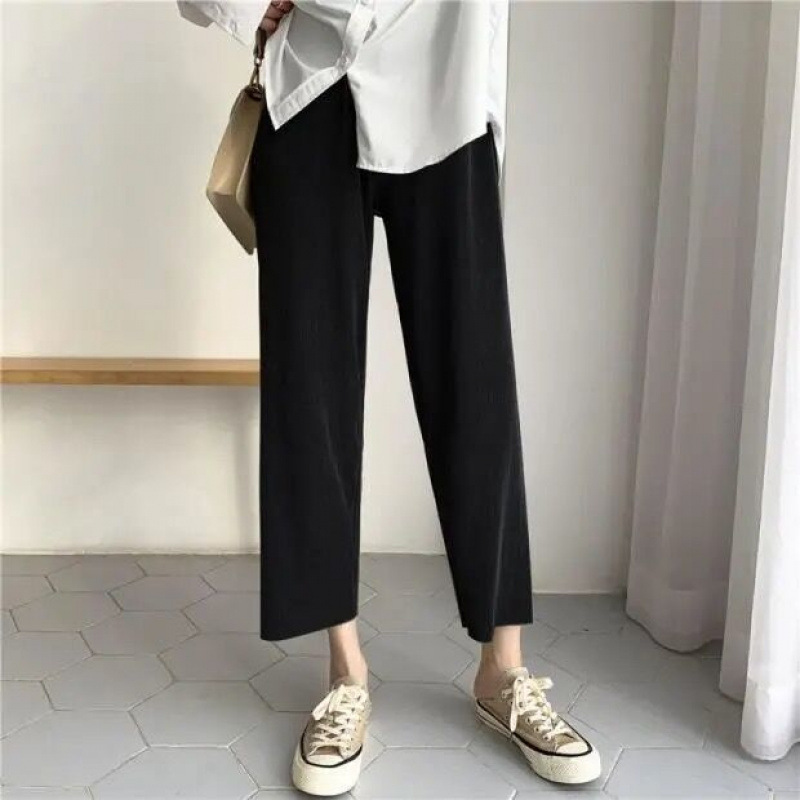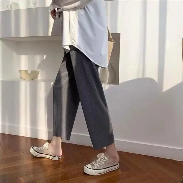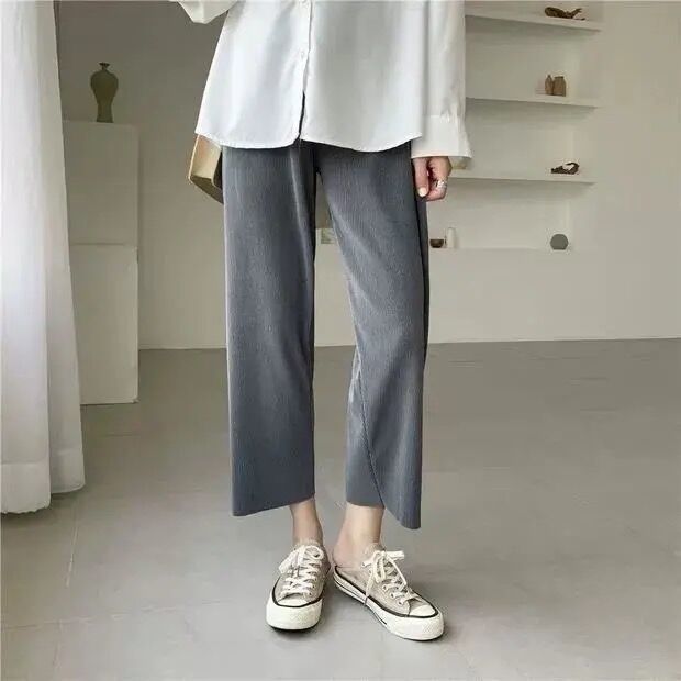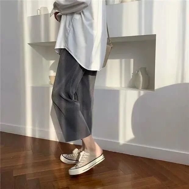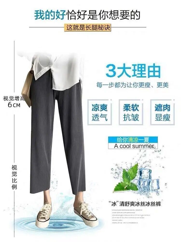 2024 년 여름 플러스 사이즈 여자 아이스 실크 와이드 레그 팬츠 느슨한 슬리밍 통통한 높은 허리 Daggy 올매치 크롭 캐주얼 팬츠스토어 가기