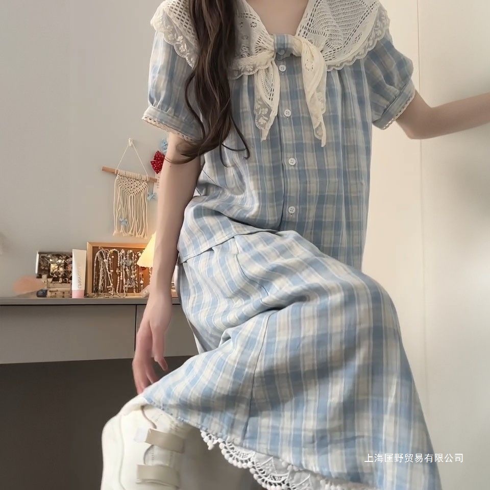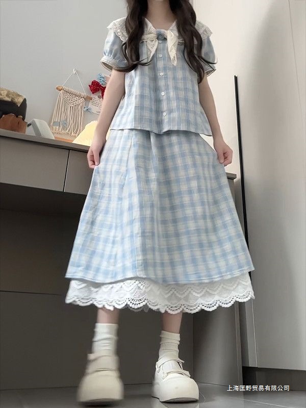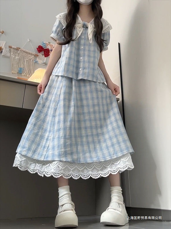 세트/원피스 달콤한 파란색 격자 무늬 버블 슬리브 목도리 칼라 셔츠 레이스 스티칭 탄성 하이 허리 스커트스토어 가기