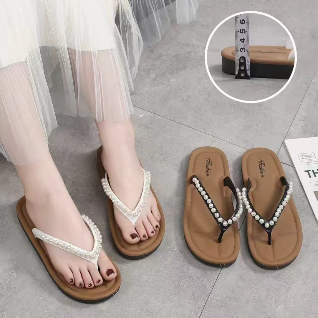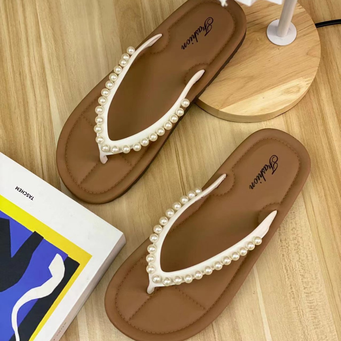 플립 플롭 여성 아웃 2025 여름 새로운 착용 방지 진주 패션 소프트 하단 비치 플랫 샌들스토어 가기