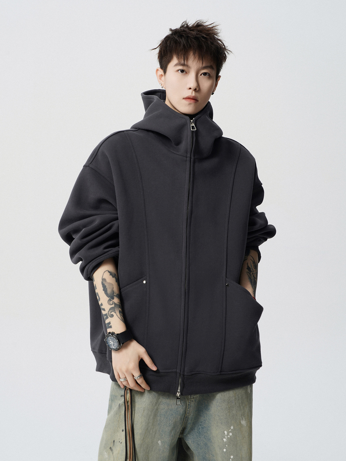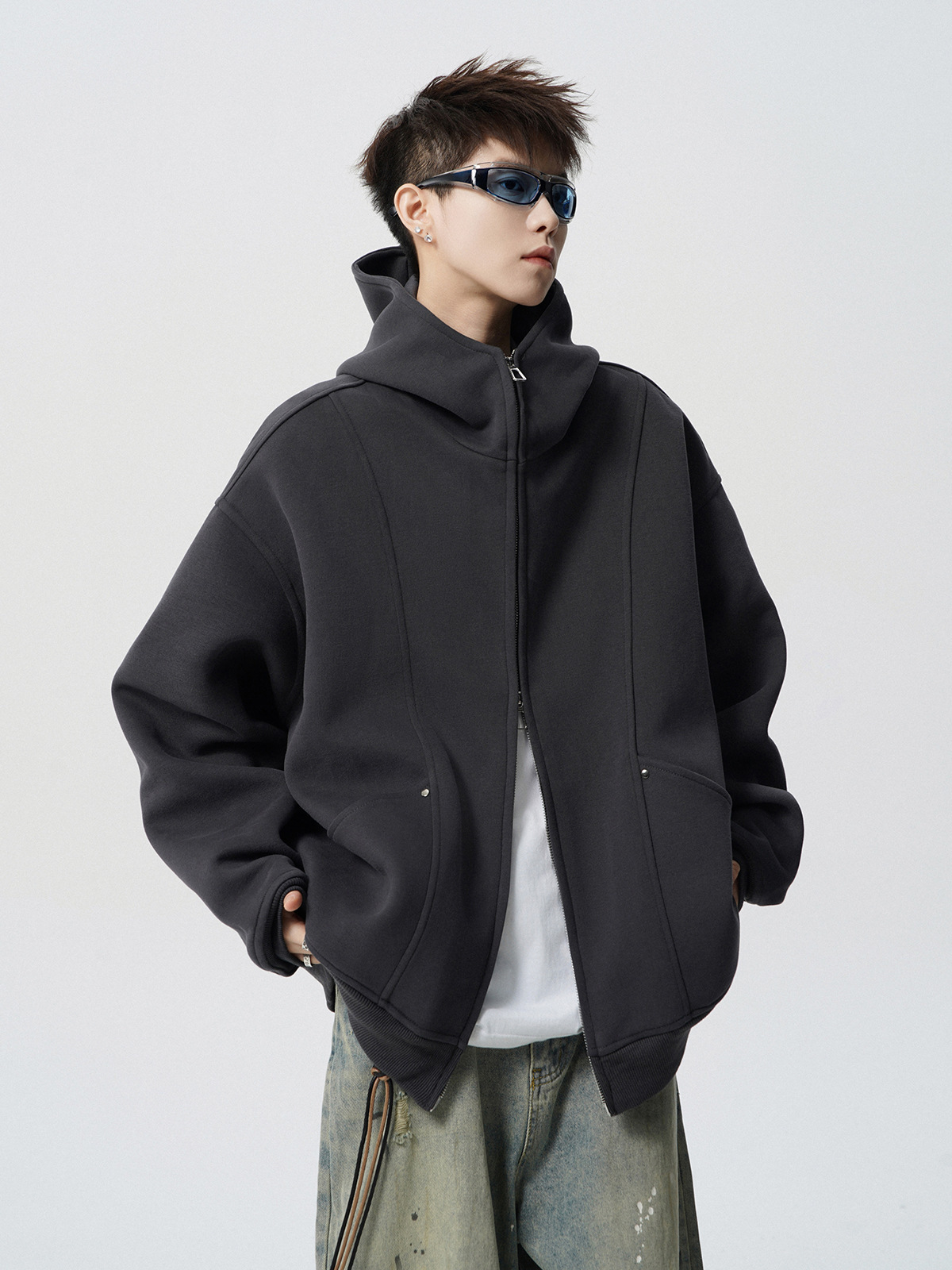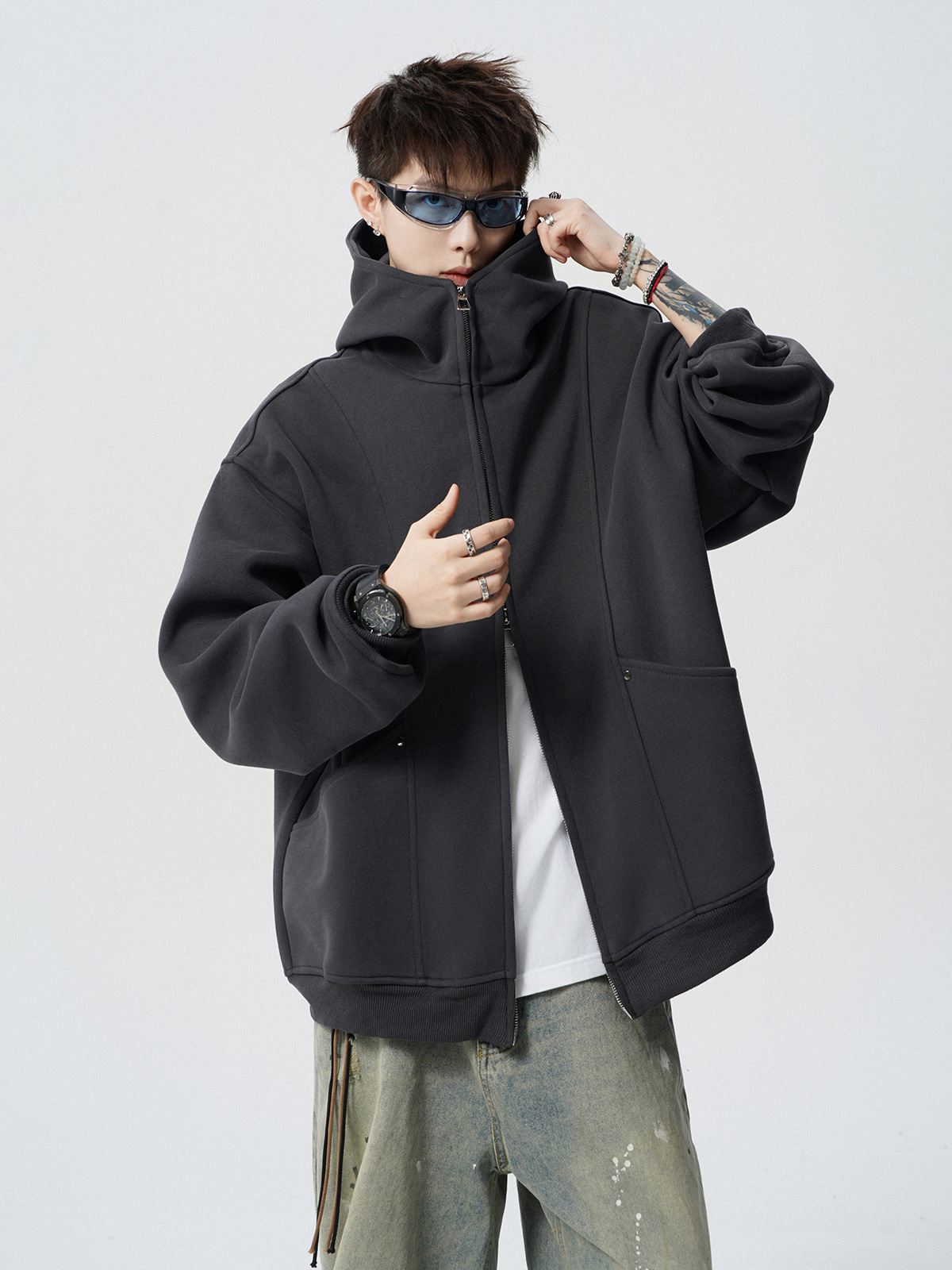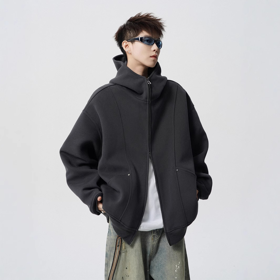 헤비 다크 그레이 후드 자켓 남자 겨울 미국 스타일 Laid-back 두꺼운 커플 재킷 트렌디 한 브랜드 디자인 센스 스웨터 카디건스토어 가기
