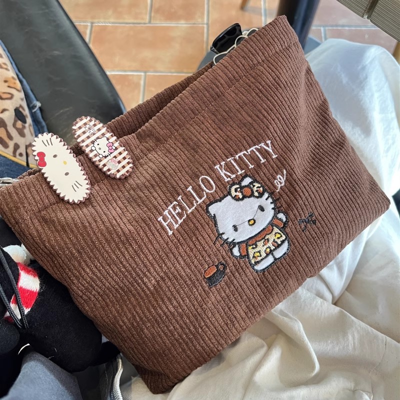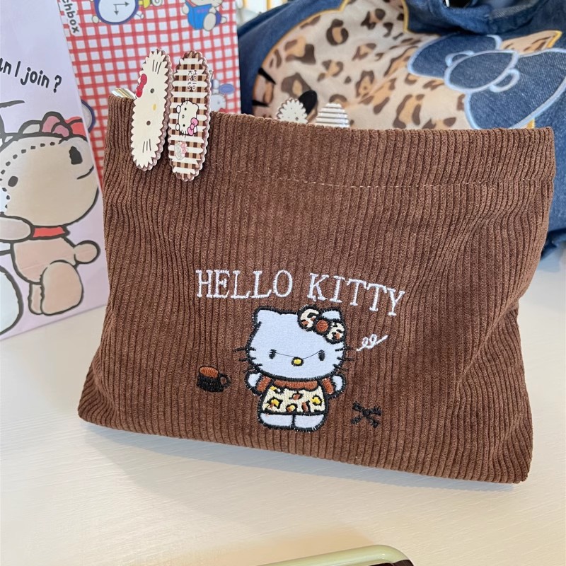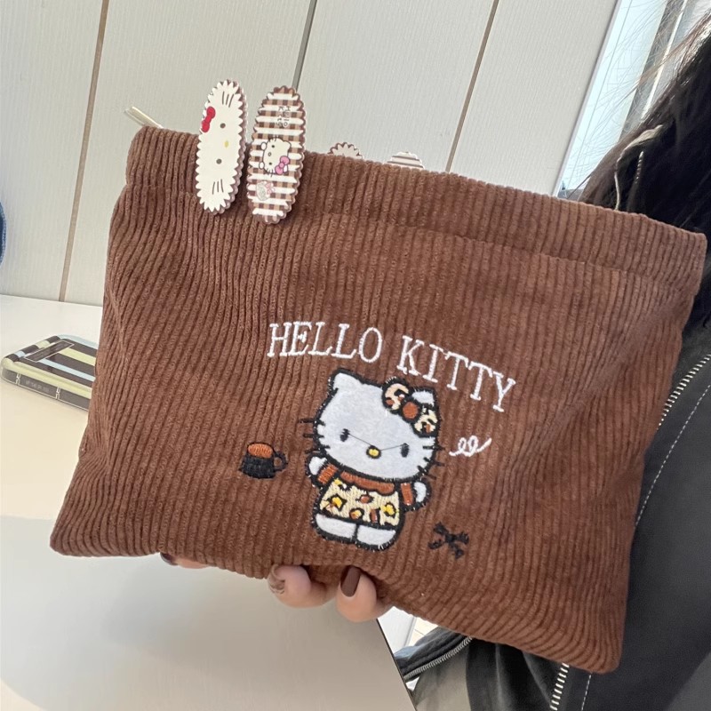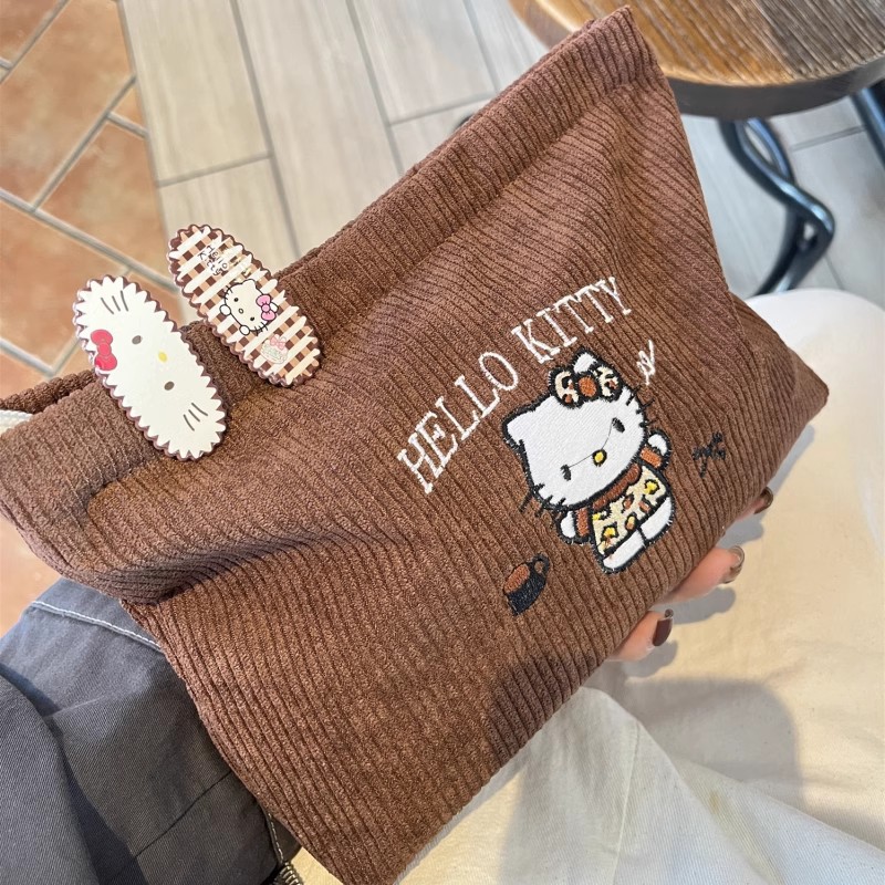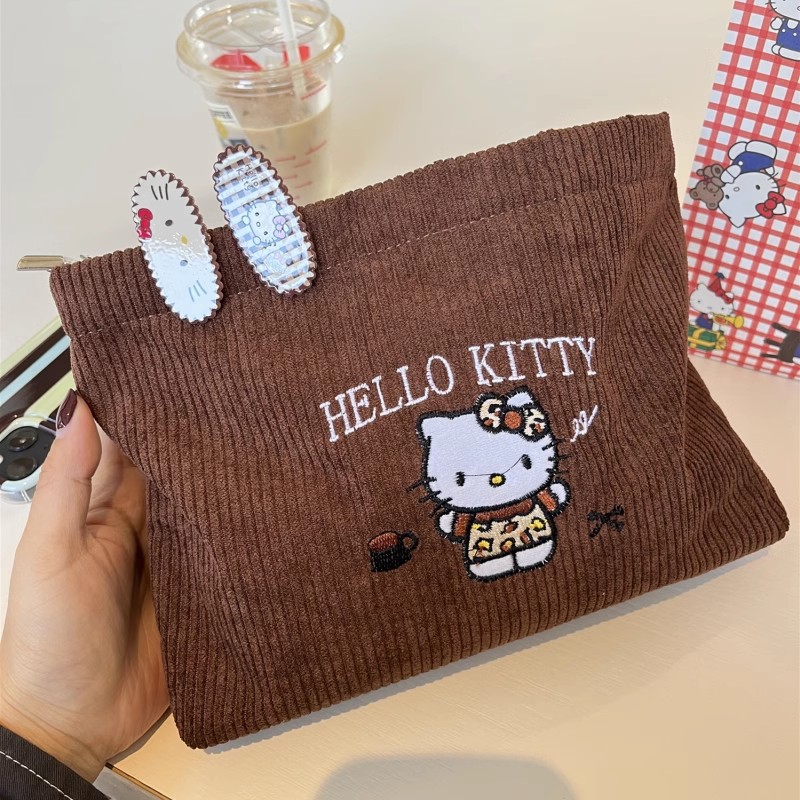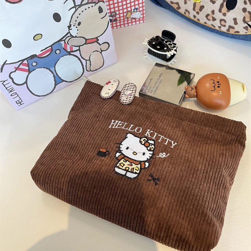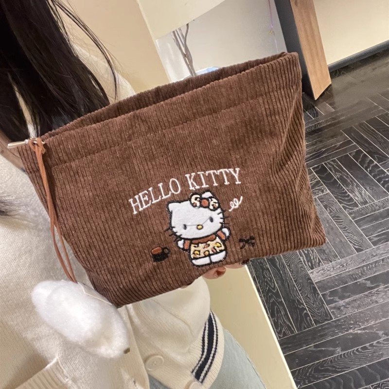 원래 다크 브라운 벨벳 화장품 가방 귀여운 자수 키티 클러치 백 여성 휴대용 대용량 우유 저장 가방스토어 가기