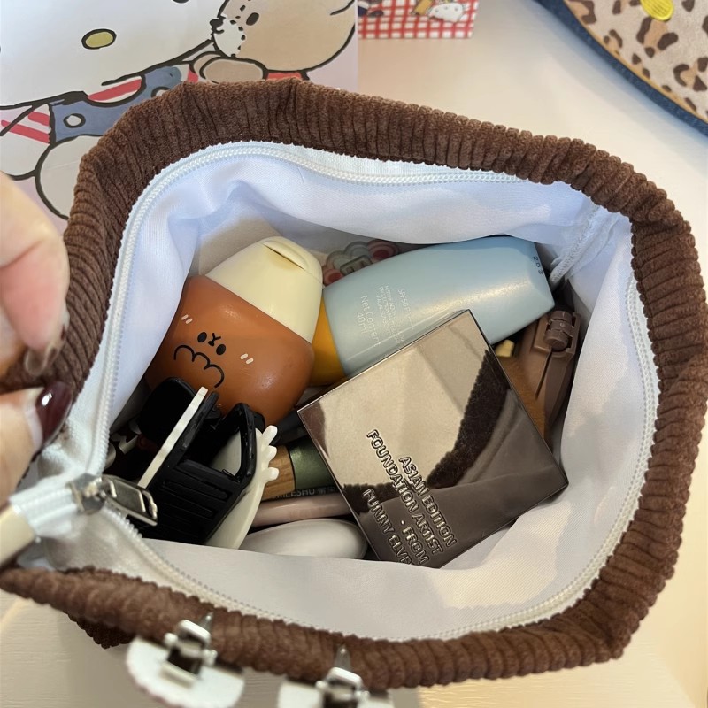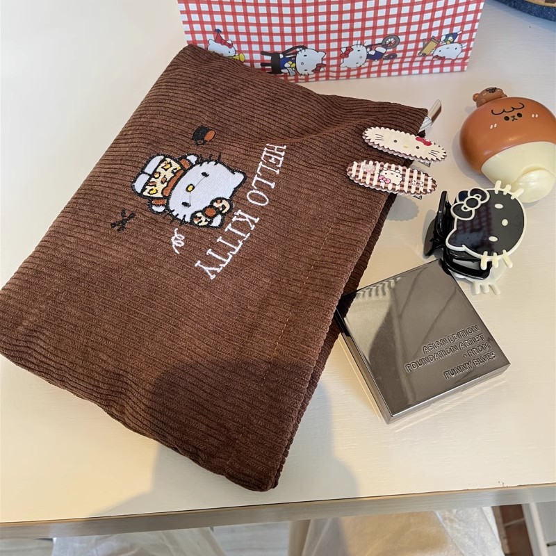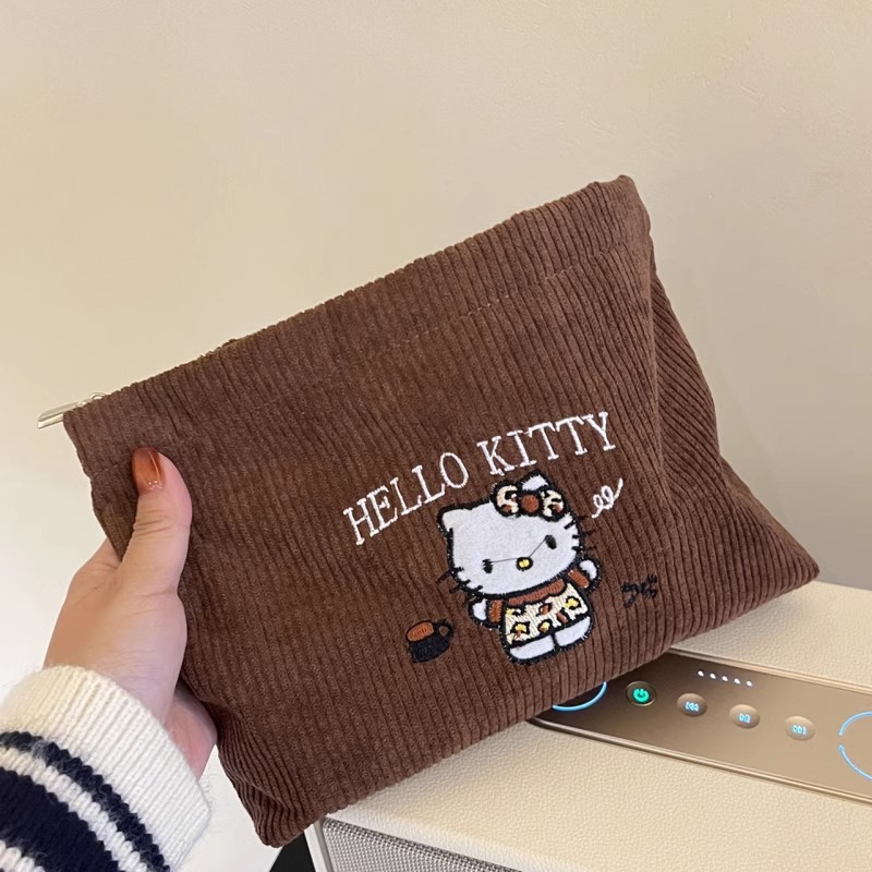 원래 다크 브라운 벨벳 화장품 가방 귀여운 자수 키티 클러치 백 여성 휴대용 대용량 우유 저장 가방
