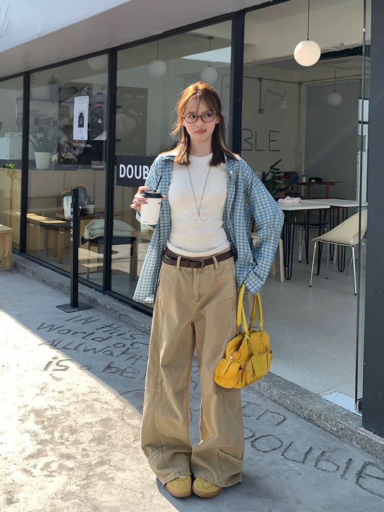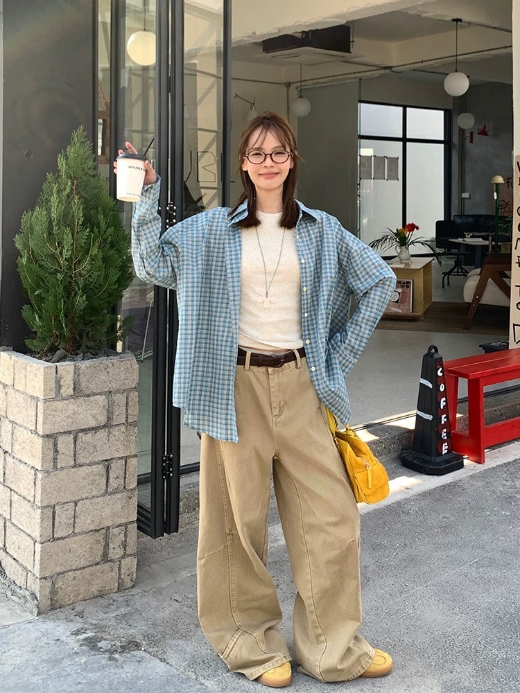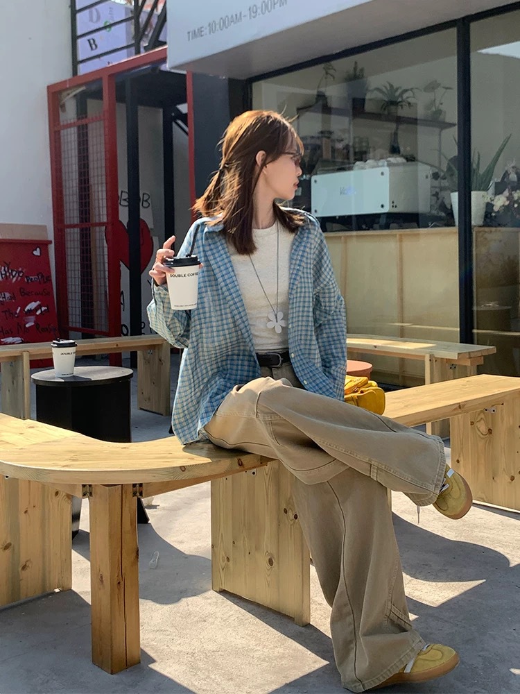 송 정겐 블루 격자 무늬 셔츠 코트 여자 봄 한국 스타일 레이아웃 백 루즈 패셔블 올 매치 세련된 셔츠 탑스토어 가기