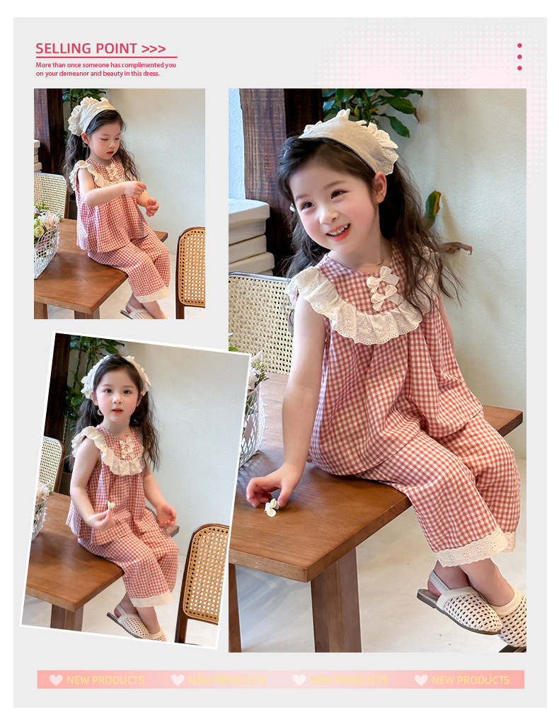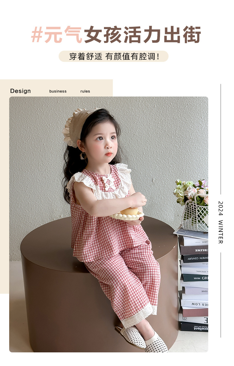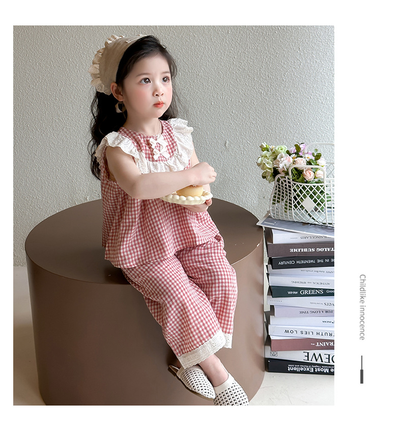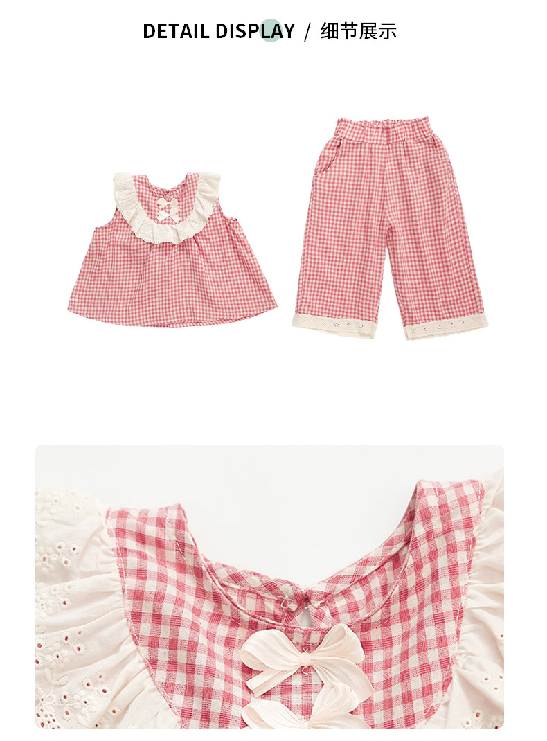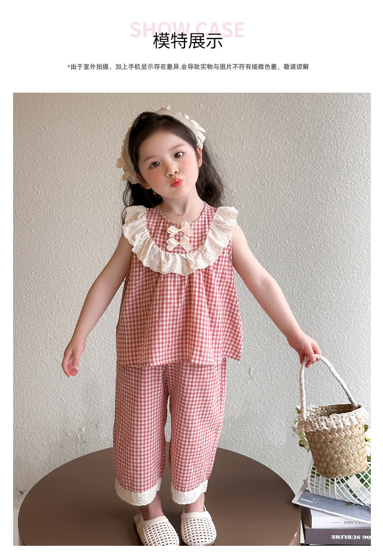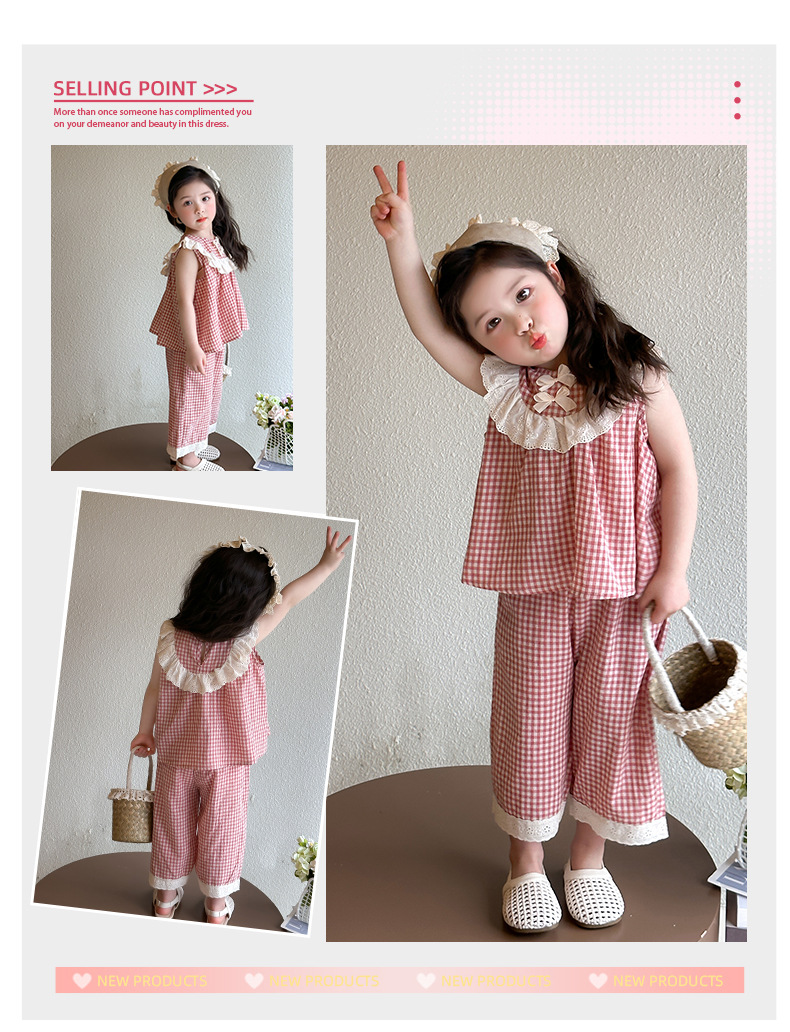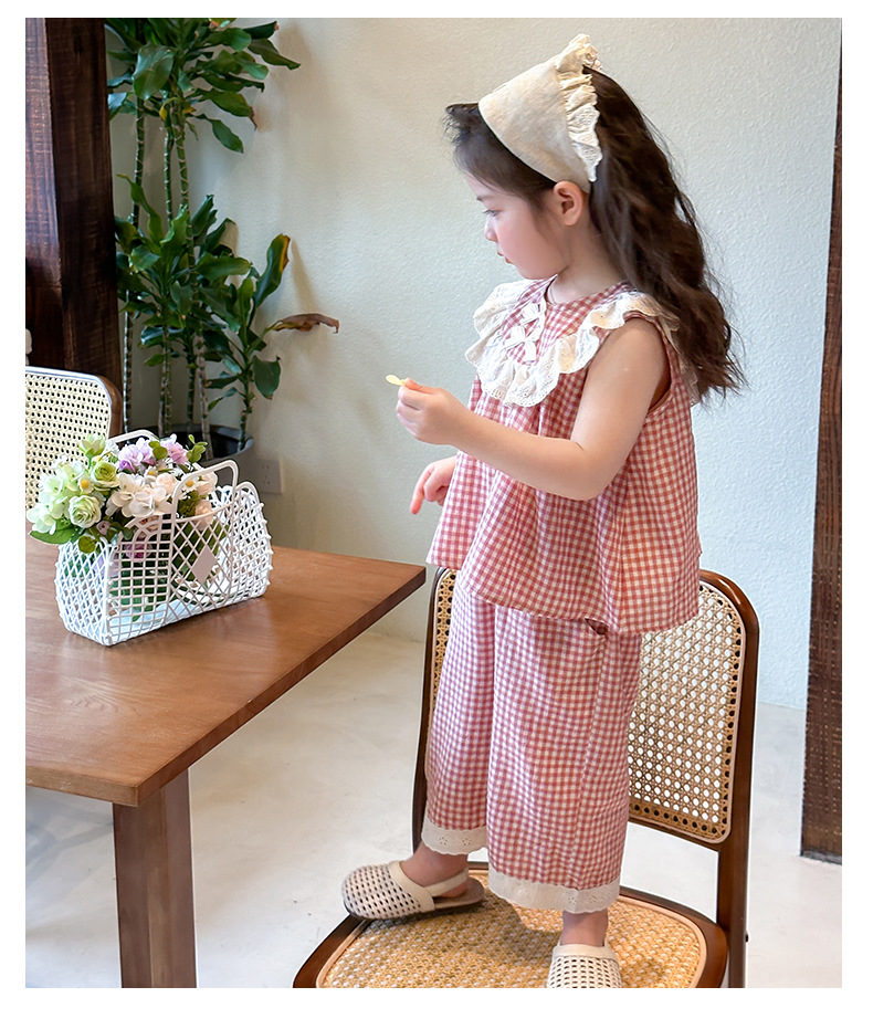 여자 격자 무늬 세트 2025 새로운 여름 아기 한국 활 인형 셔츠 어린이 넓은 다리 바지 투피스 세트스토어 가기