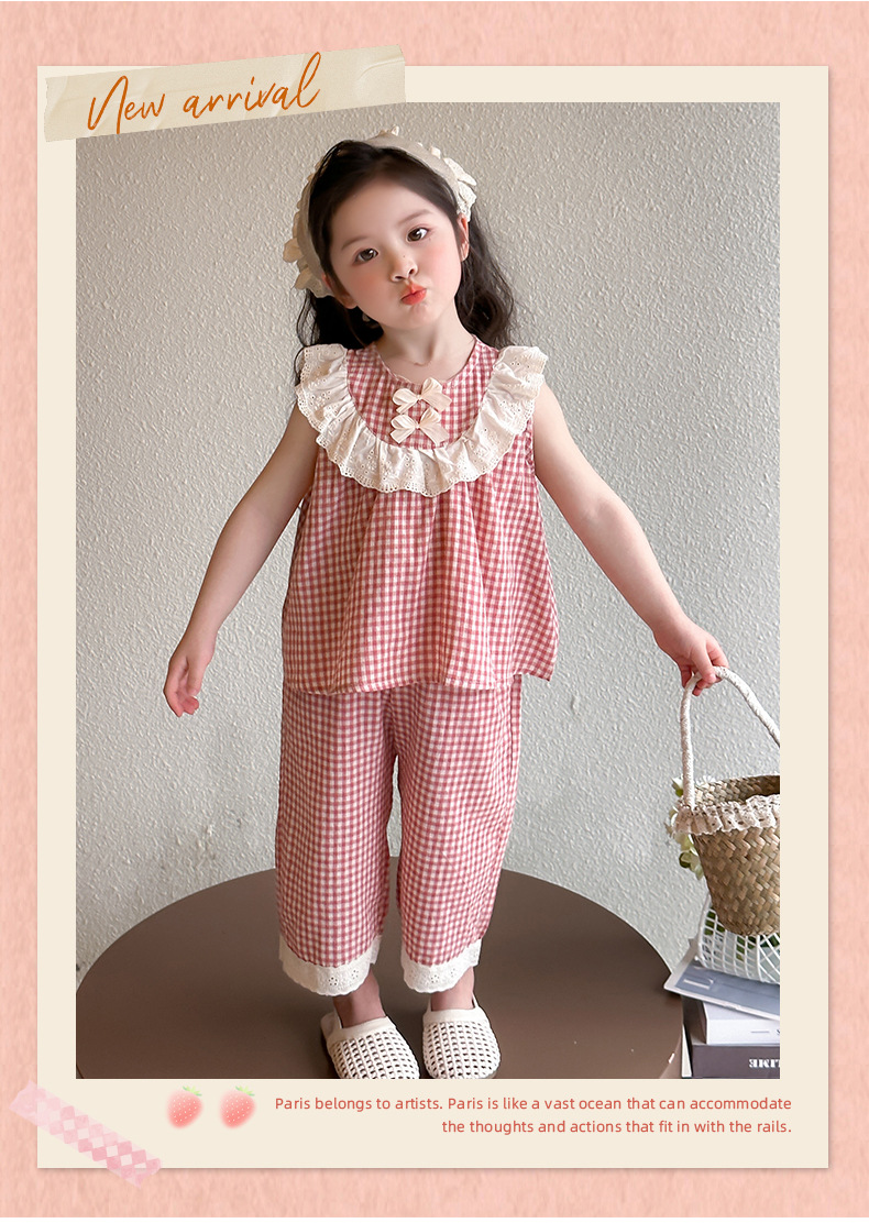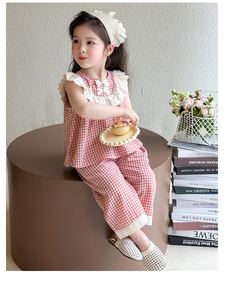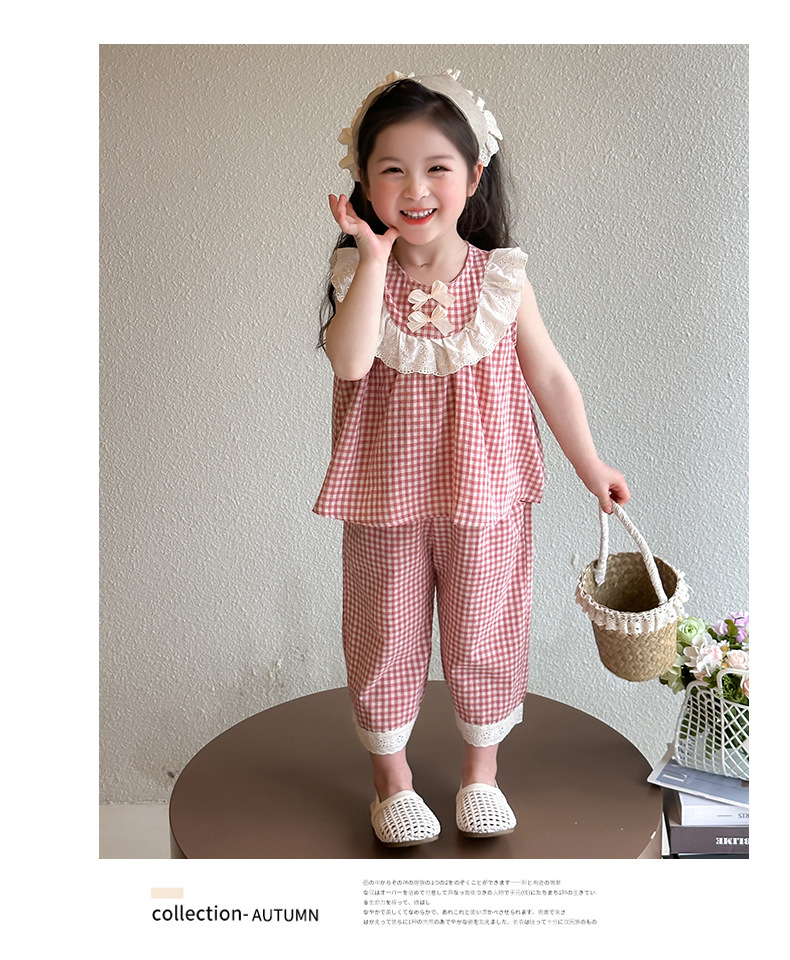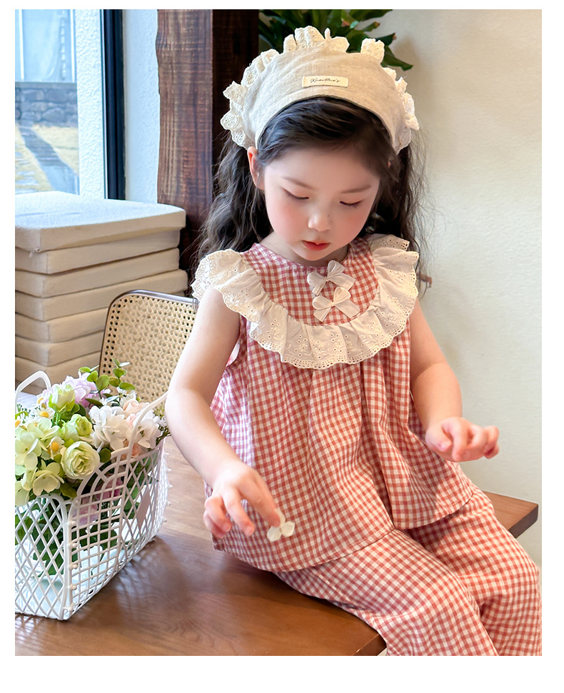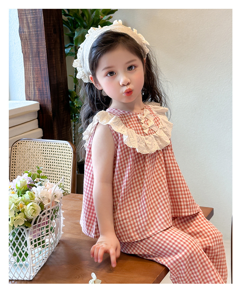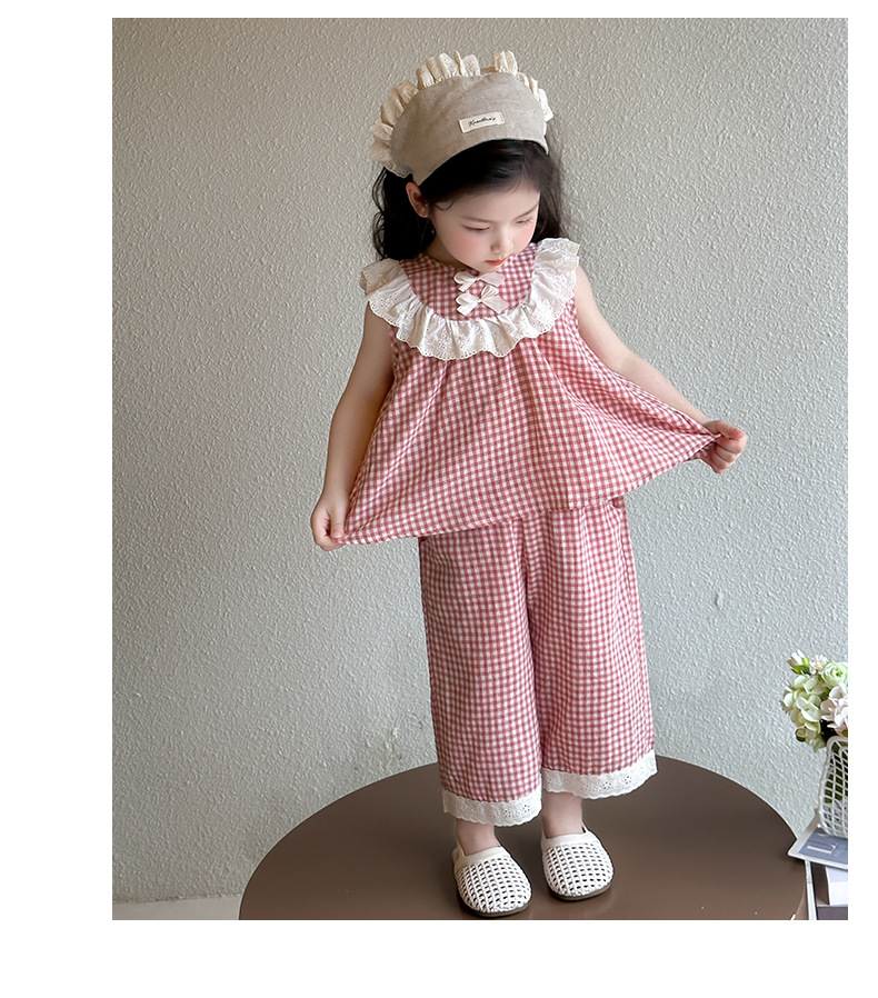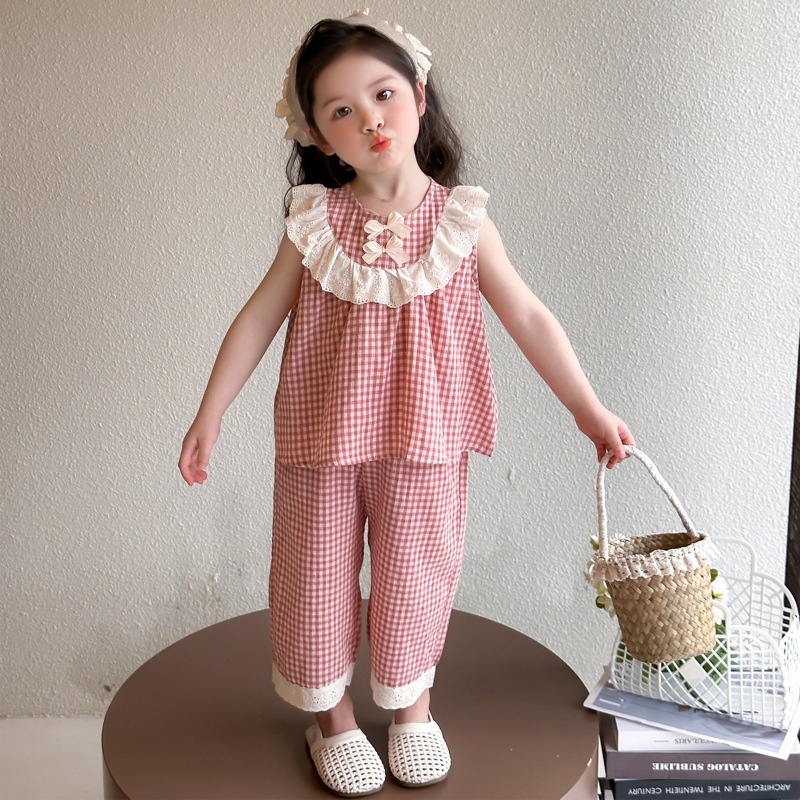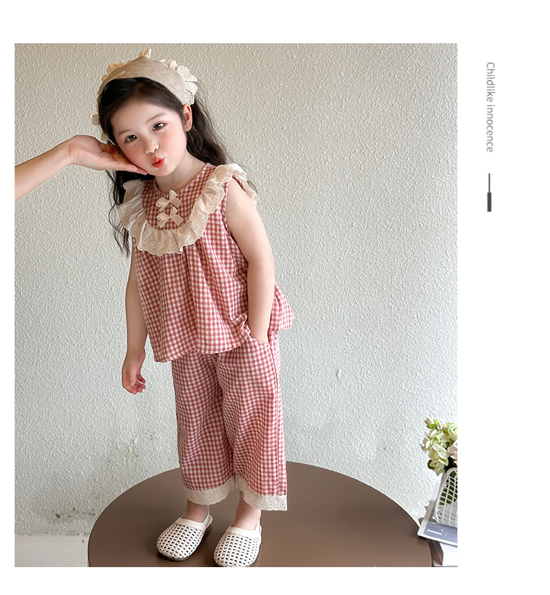 여자 격자 무늬 세트 2025 새로운 여름 아기 한국 활 인형 셔츠 어린이 넓은 다리 바지 투피스 세트