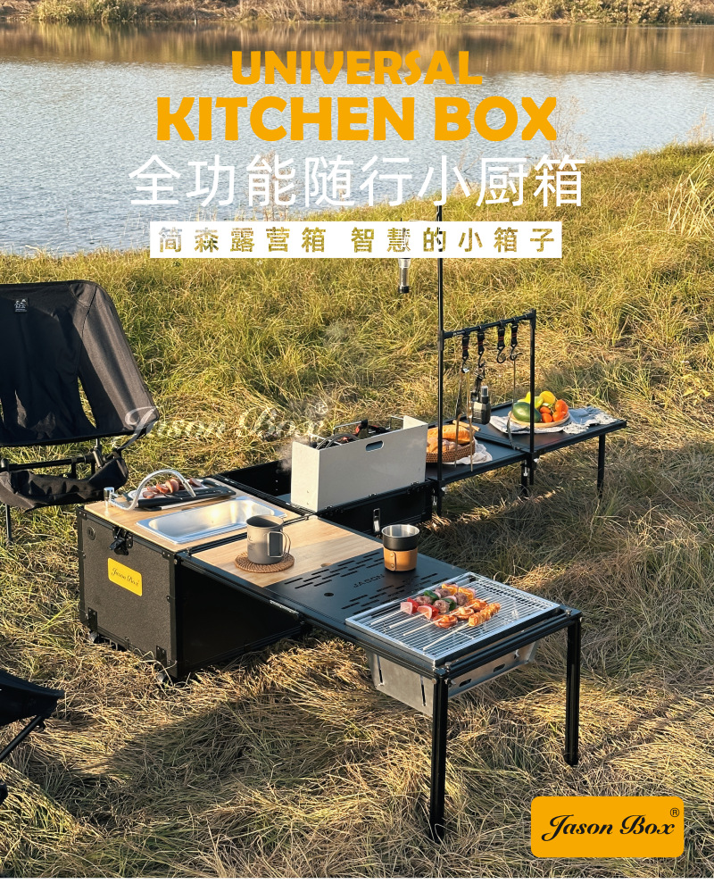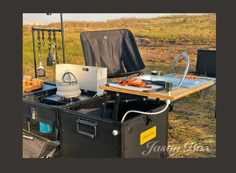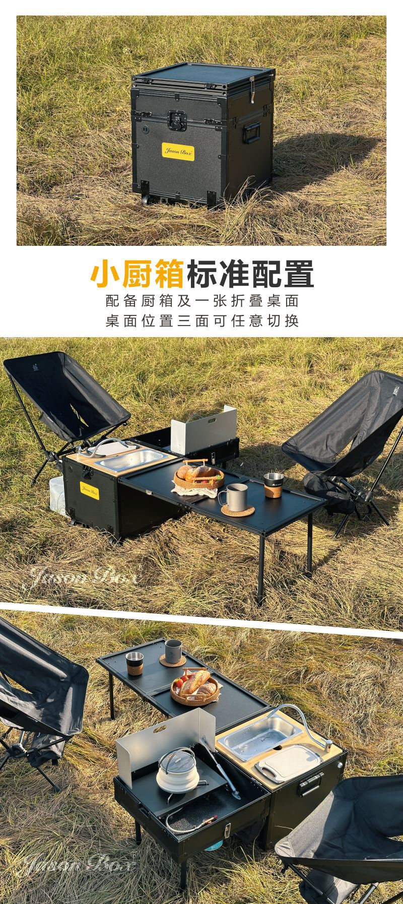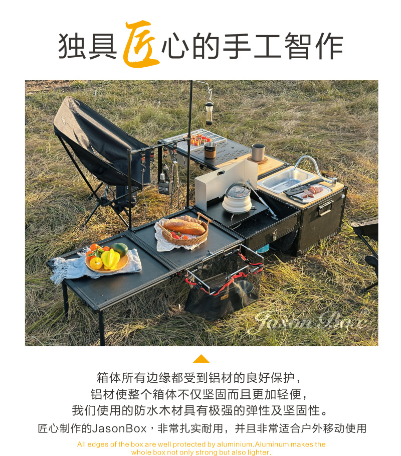 Jensen 야외 모바일 주방 차량 장착 다기능 소형 주방 상자 야영 야생 밥솥 스토브 바베큐 접이식 테이블 휴대용 바퀴