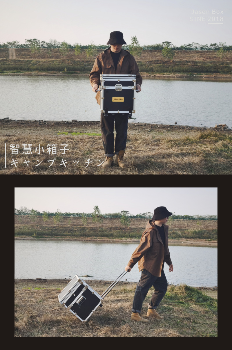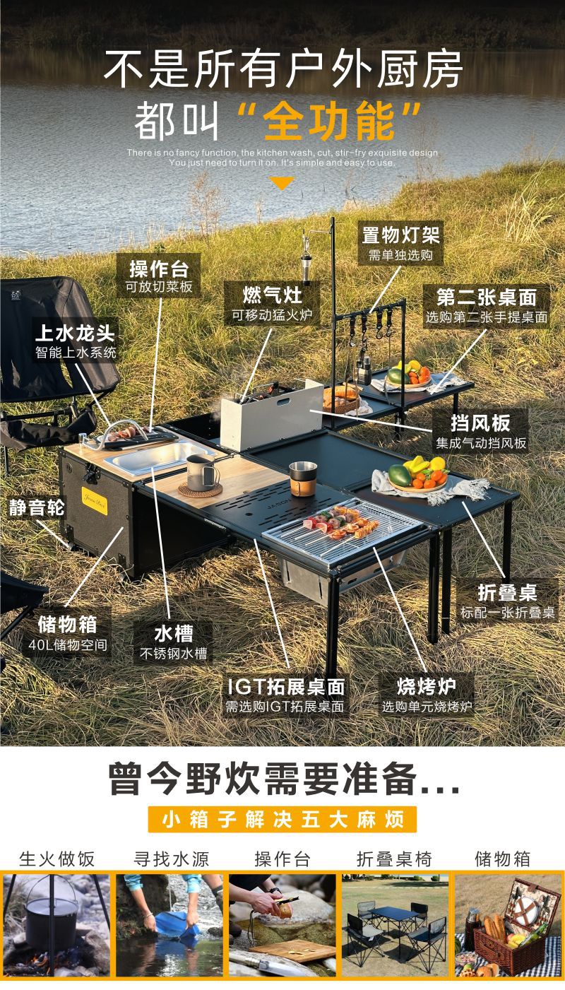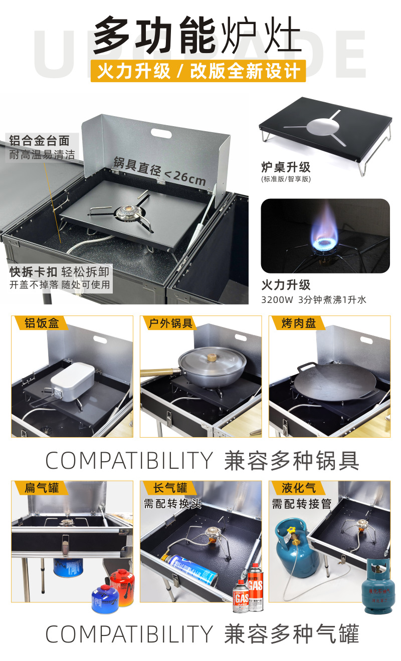 Jensen 야외 모바일 주방 차량 장착 다기능 소형 주방 상자 야영 야생 밥솥 스토브 바베큐 접이식 테이블 휴대용 바퀴