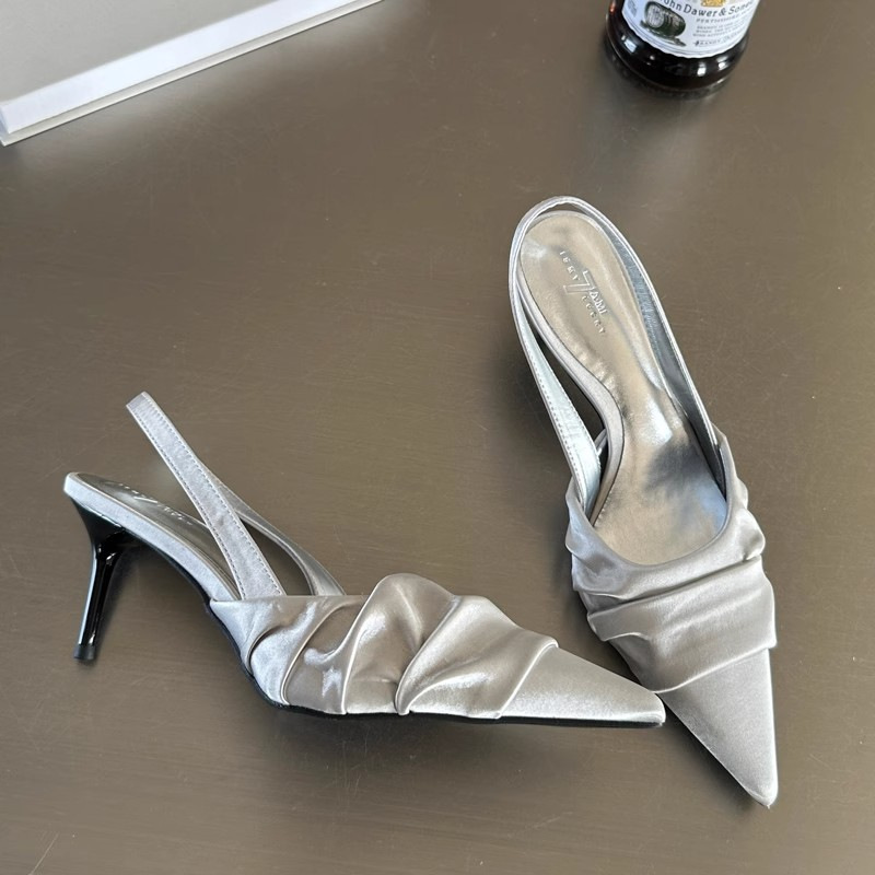 2025 년 봄과 여름 새로운 주름 작은 뾰족한 하이힐 얕은 최고 여성 실버 이브닝 슈즈