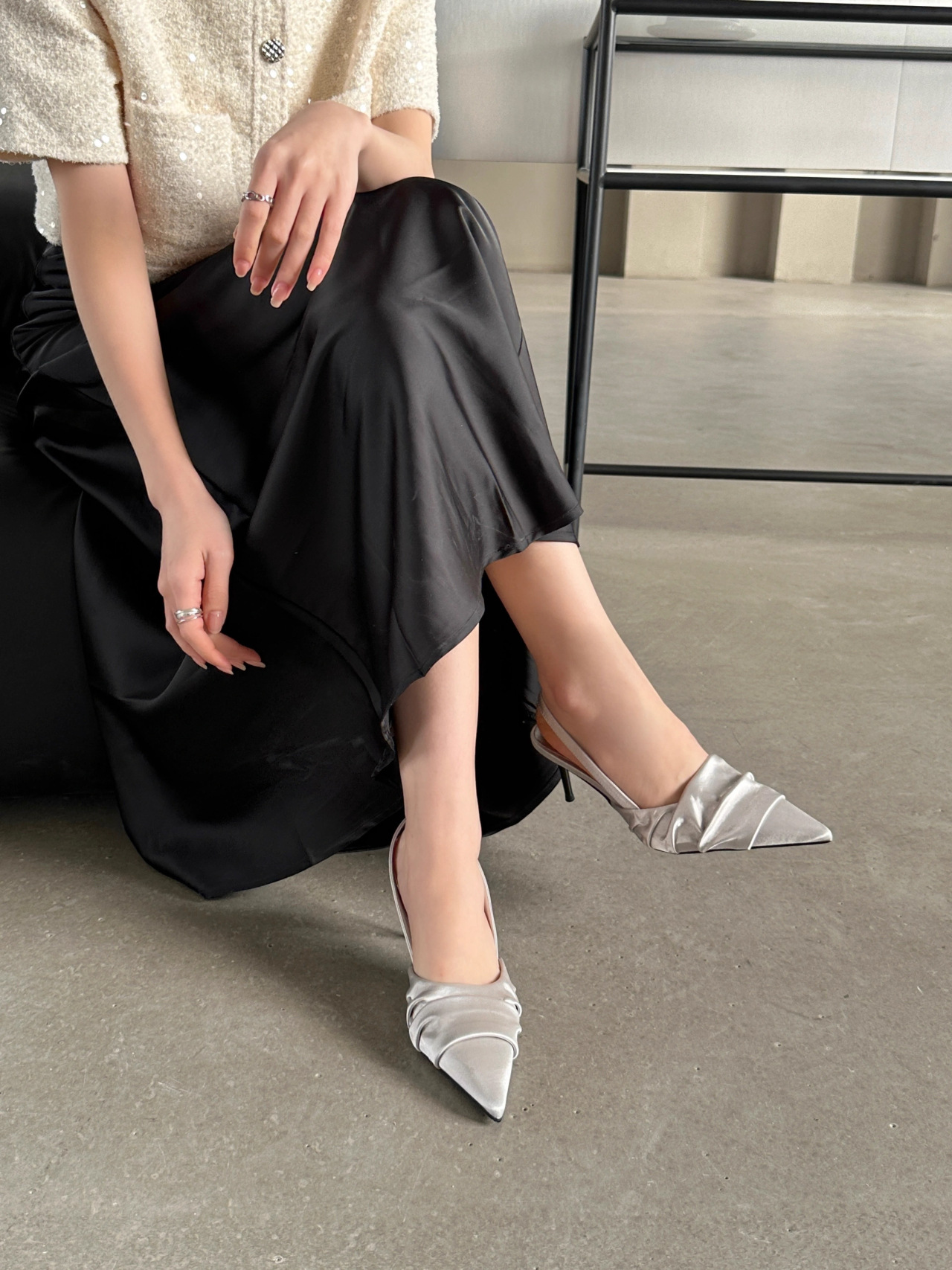 2025 년 봄과 여름 새로운 주름 작은 뾰족한 하이힐 얕은 최고 여성 실버 이브닝 슈즈스토어 가기