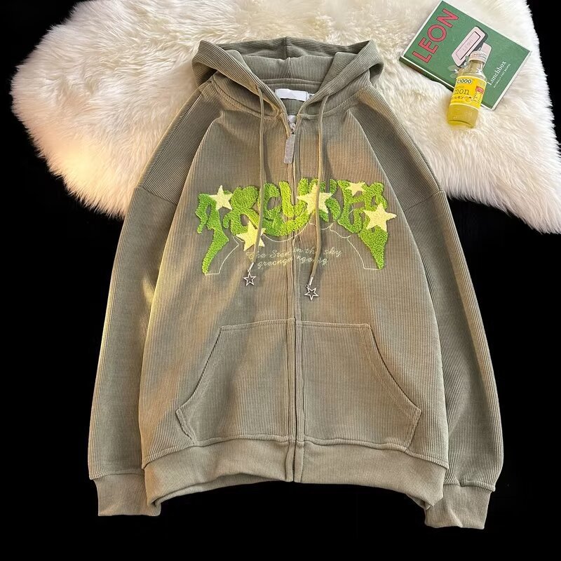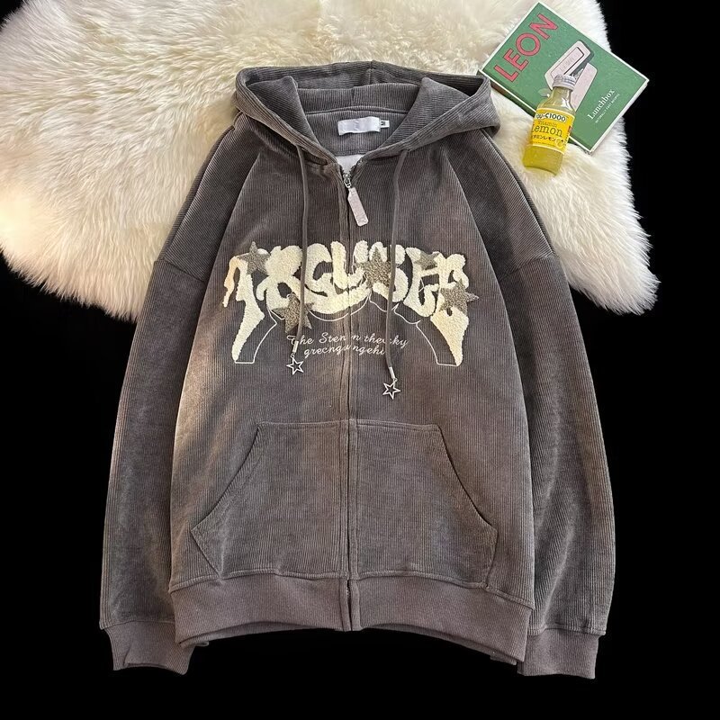 국경을 넘는 미국식 기모 두꺼운 빈티지 편지 자수 후드 카디건 스웨터 커플 루즈 후디 재킷