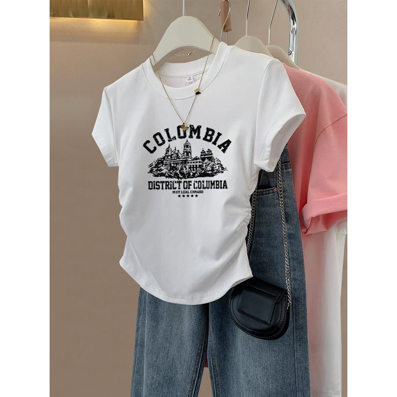 어깨 플러스 사이즈 반팔 Fishbone 티셔츠 여성 디자인 센스 틈새 슬림 슬리밍 육체로 덮인 시대 감소 코튼 웨스턴 스타일 탑