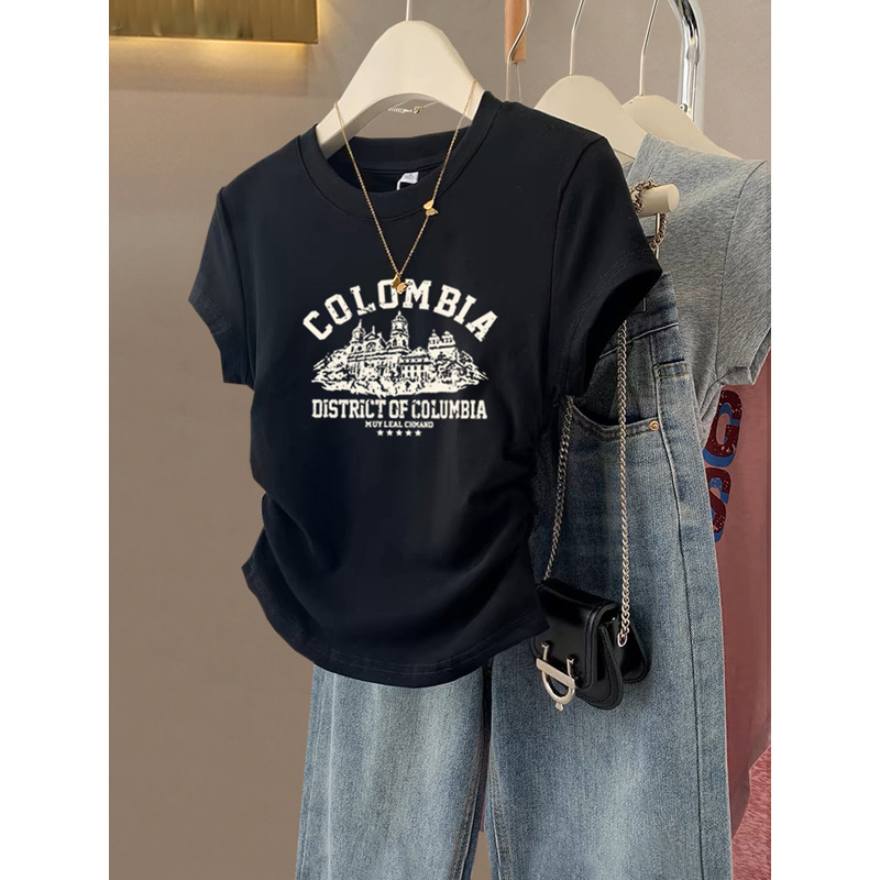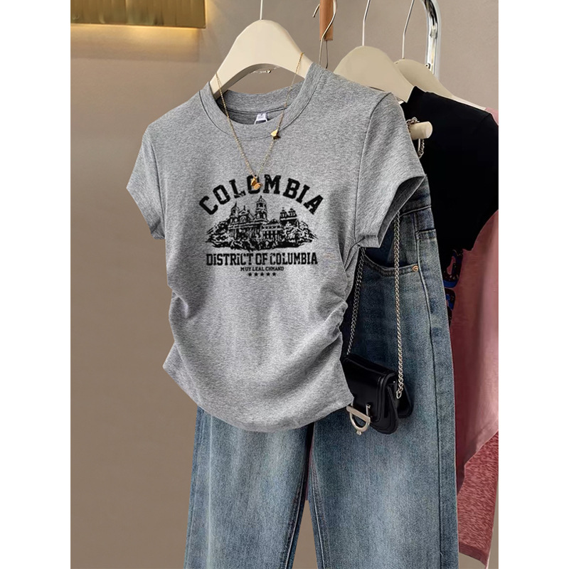 어깨 플러스 사이즈 반팔 Fishbone 티셔츠 여성 디자인 센스 틈새 슬림 슬리밍 육체로 덮인 시대 감소 코튼 웨스턴 스타일 탑스토어 가기