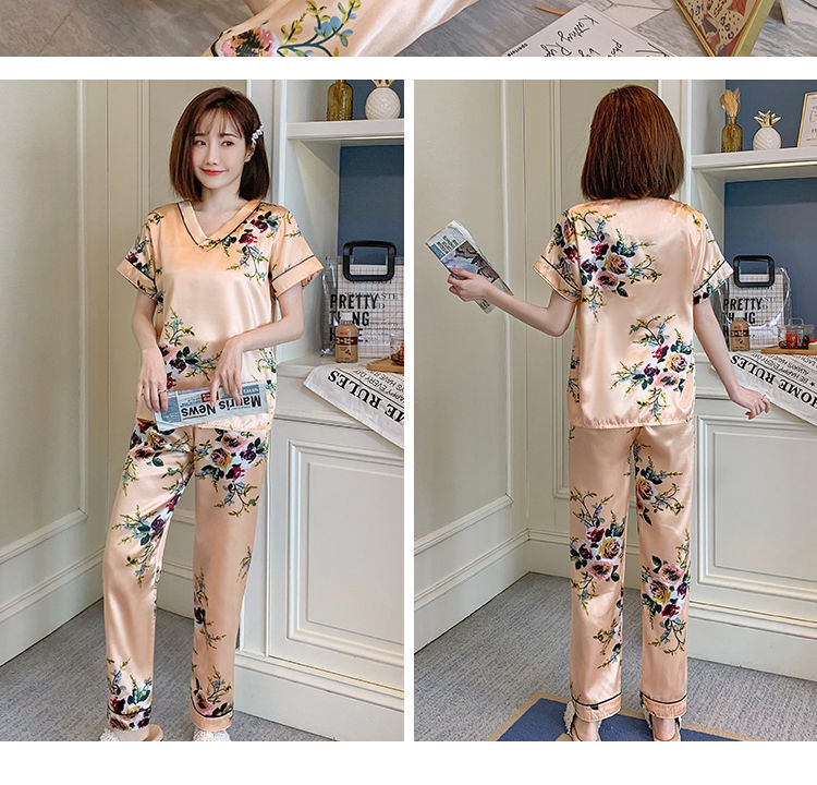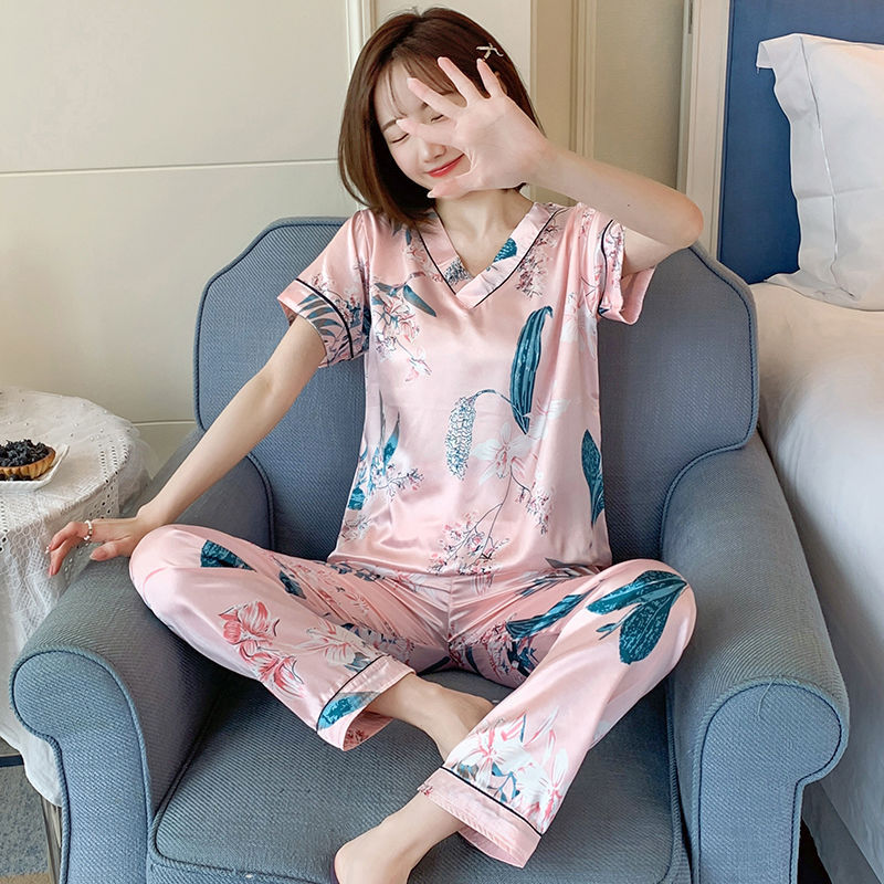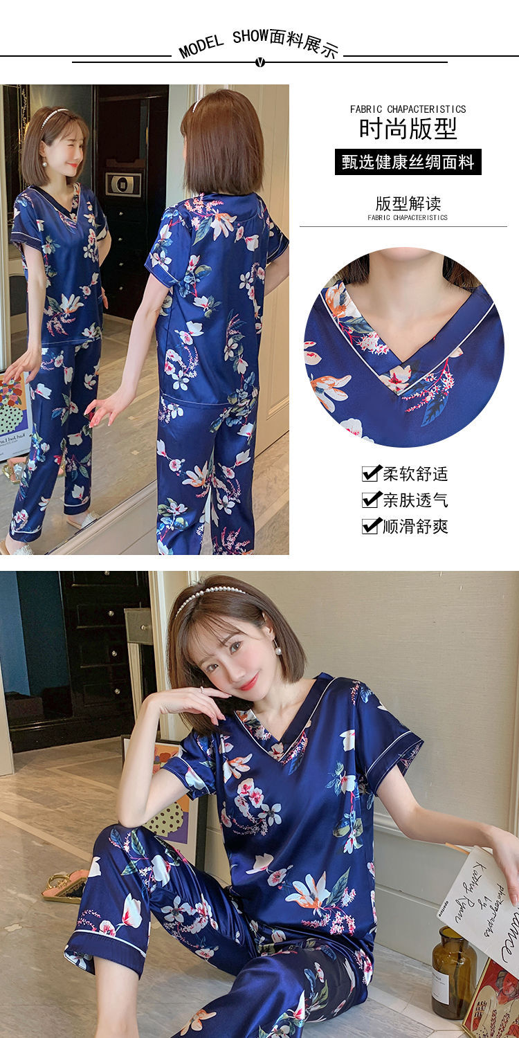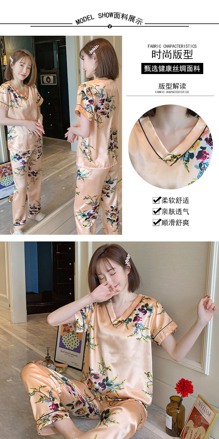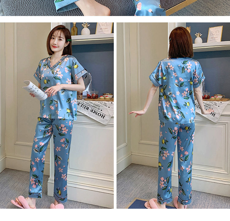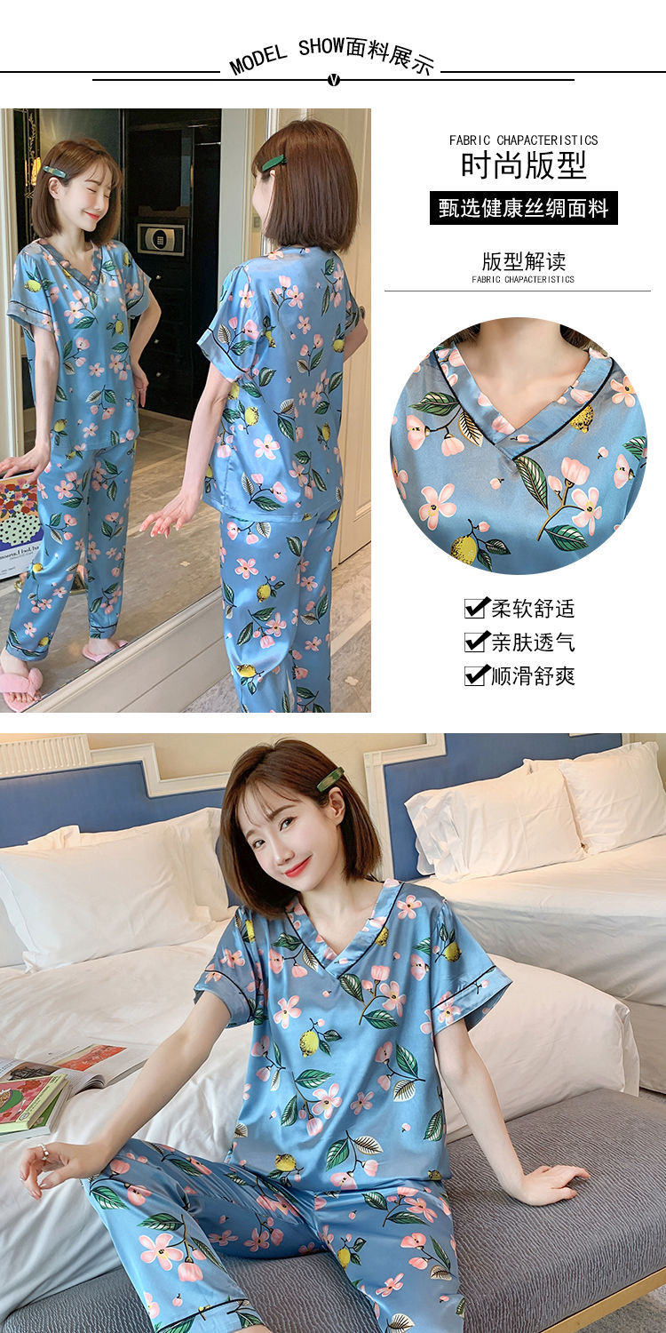 여름 잠옷 여성용 아이스 실크 반팔 바지 V 넥 한국식 스위트 실크 의상 세트 홈 옷스토어 가기