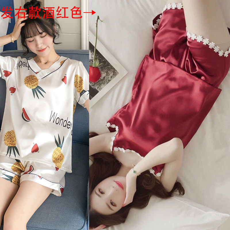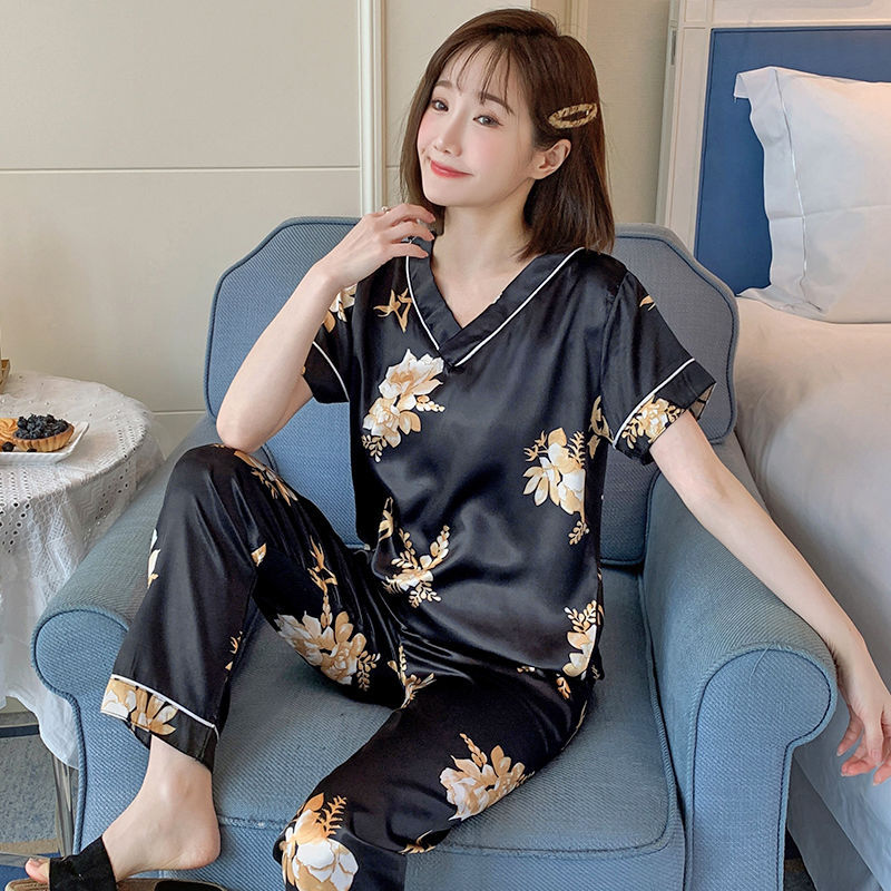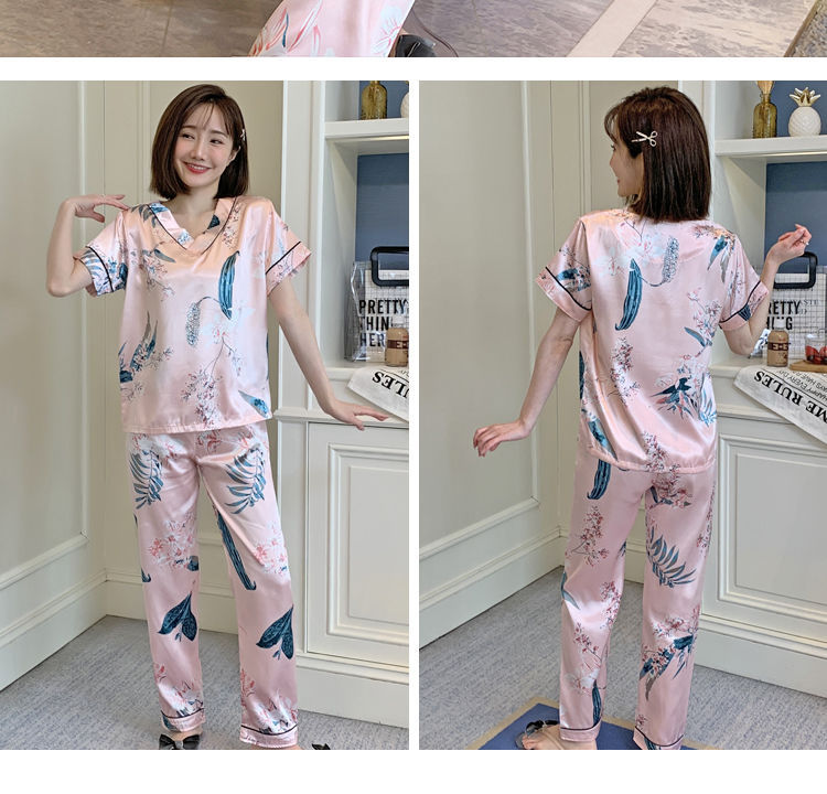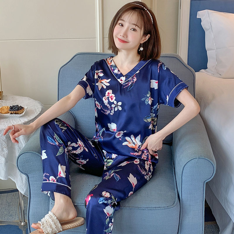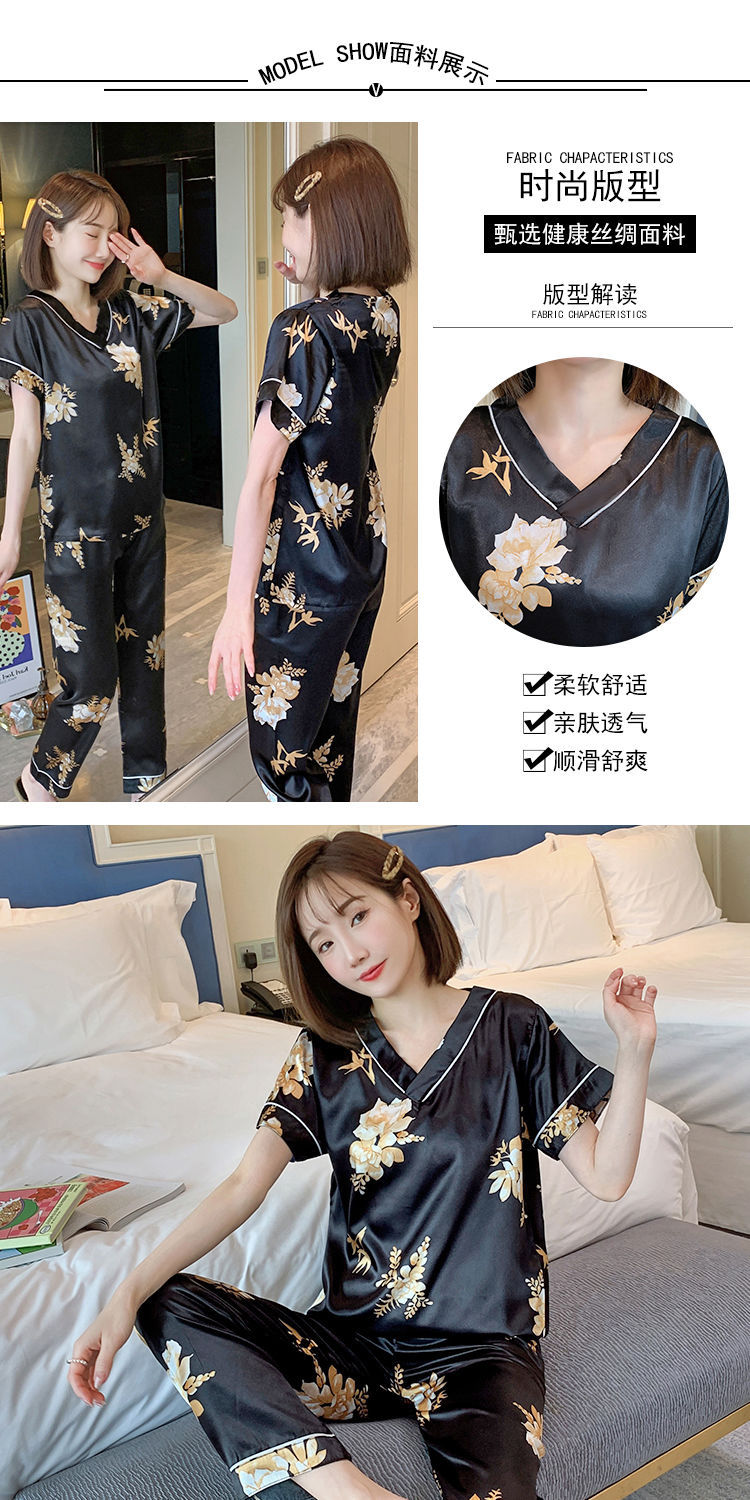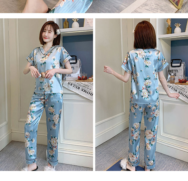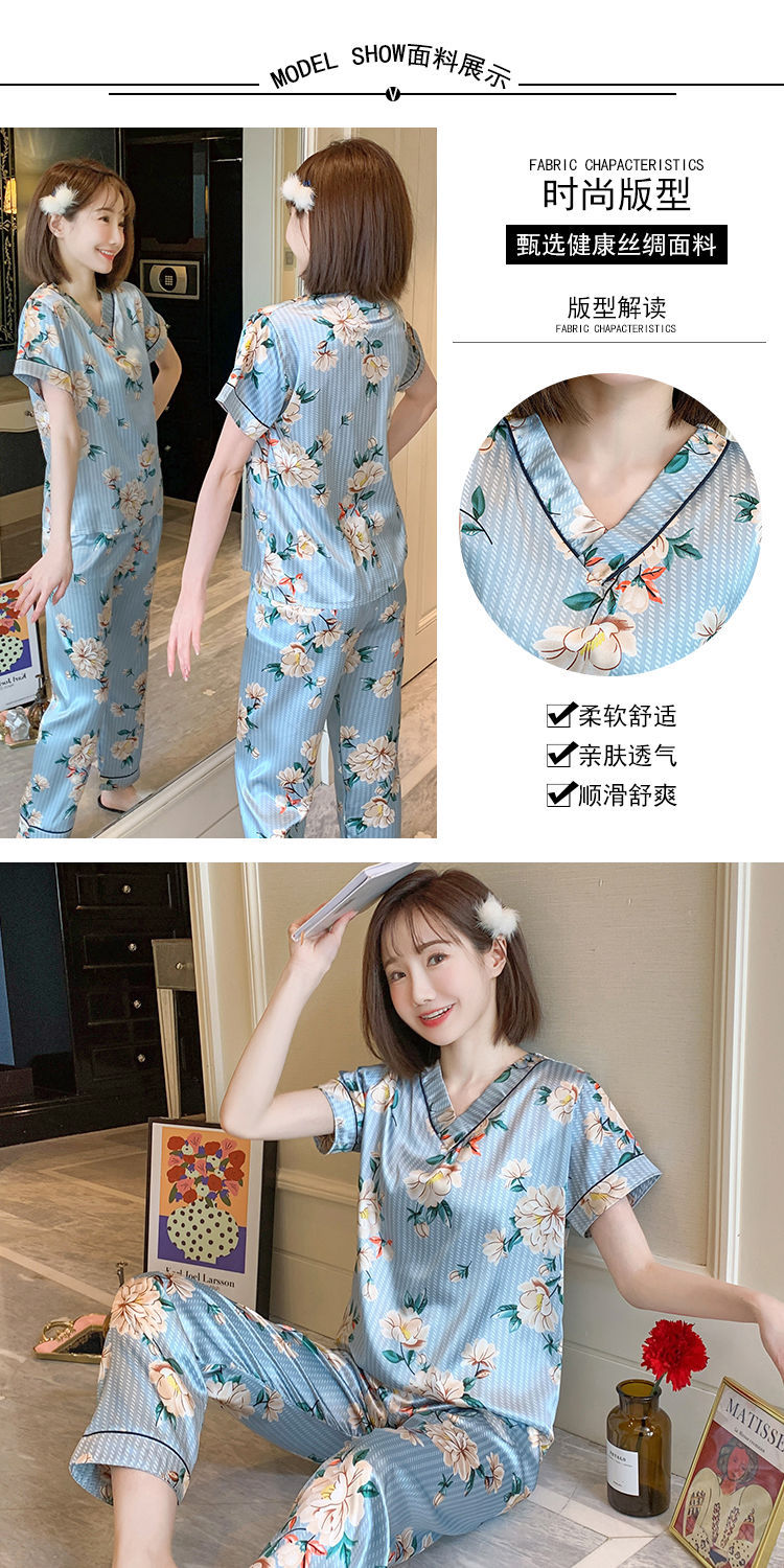 여름 잠옷 여성용 아이스 실크 반팔 바지 V 넥 한국식 스위트 실크 의상 세트 홈 옷스토어 가기