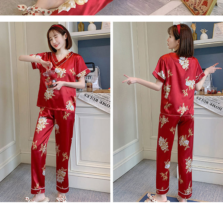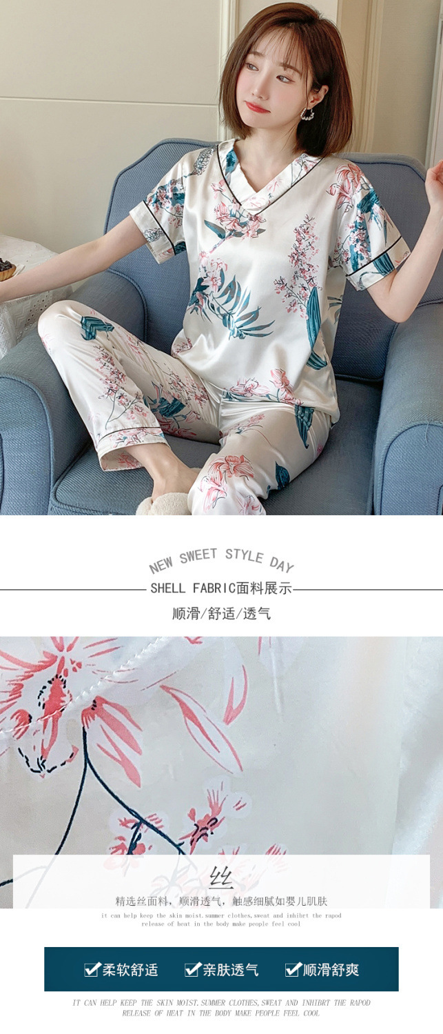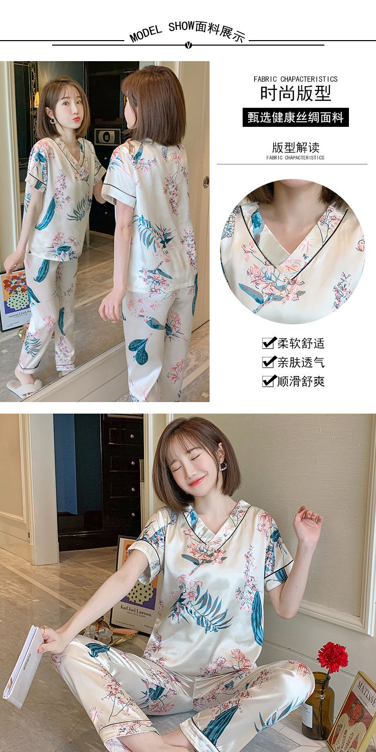 여름 잠옷 여성용 아이스 실크 반팔 바지 V 넥 한국식 스위트 실크 의상 세트 홈 옷