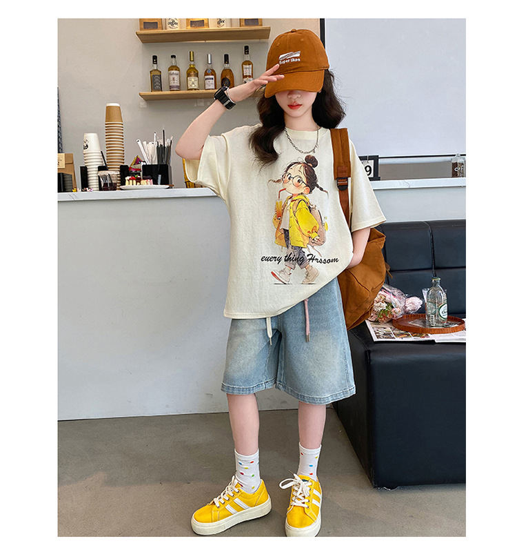 소녀 여름 반팔 티셔츠 세트 2025 새로운 어린이 데님 반바지 세련된 소녀 패션 여름 원피스스토어 가기