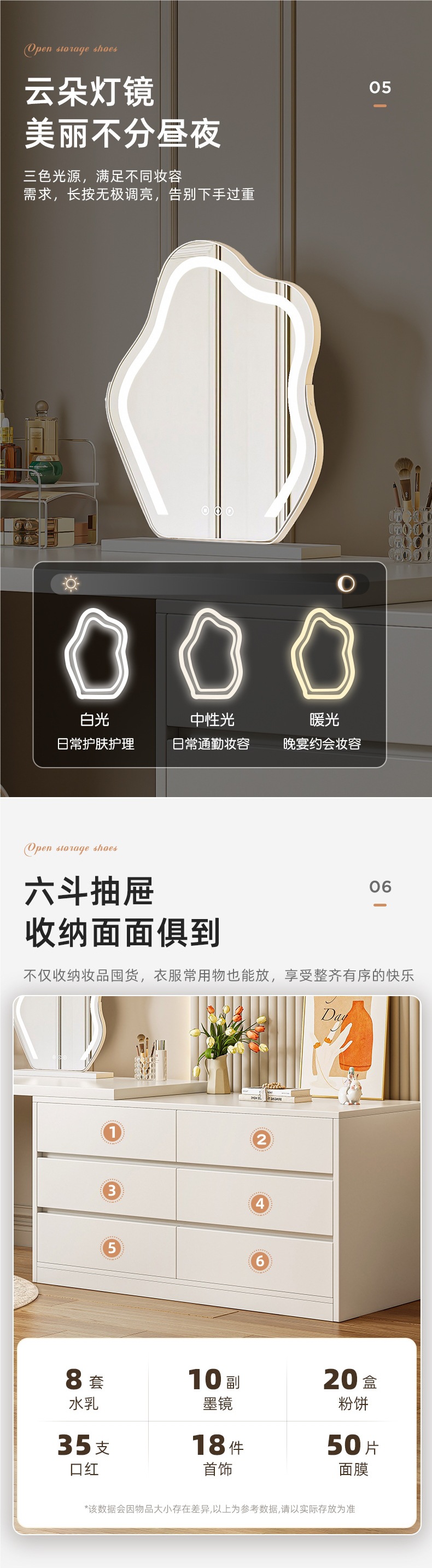 • + 크로스보더 + [메인사진] 120cm 테이블 × 2 + 120 캐비닛 + 구름거울 + 가죽 스툴 웜화이트