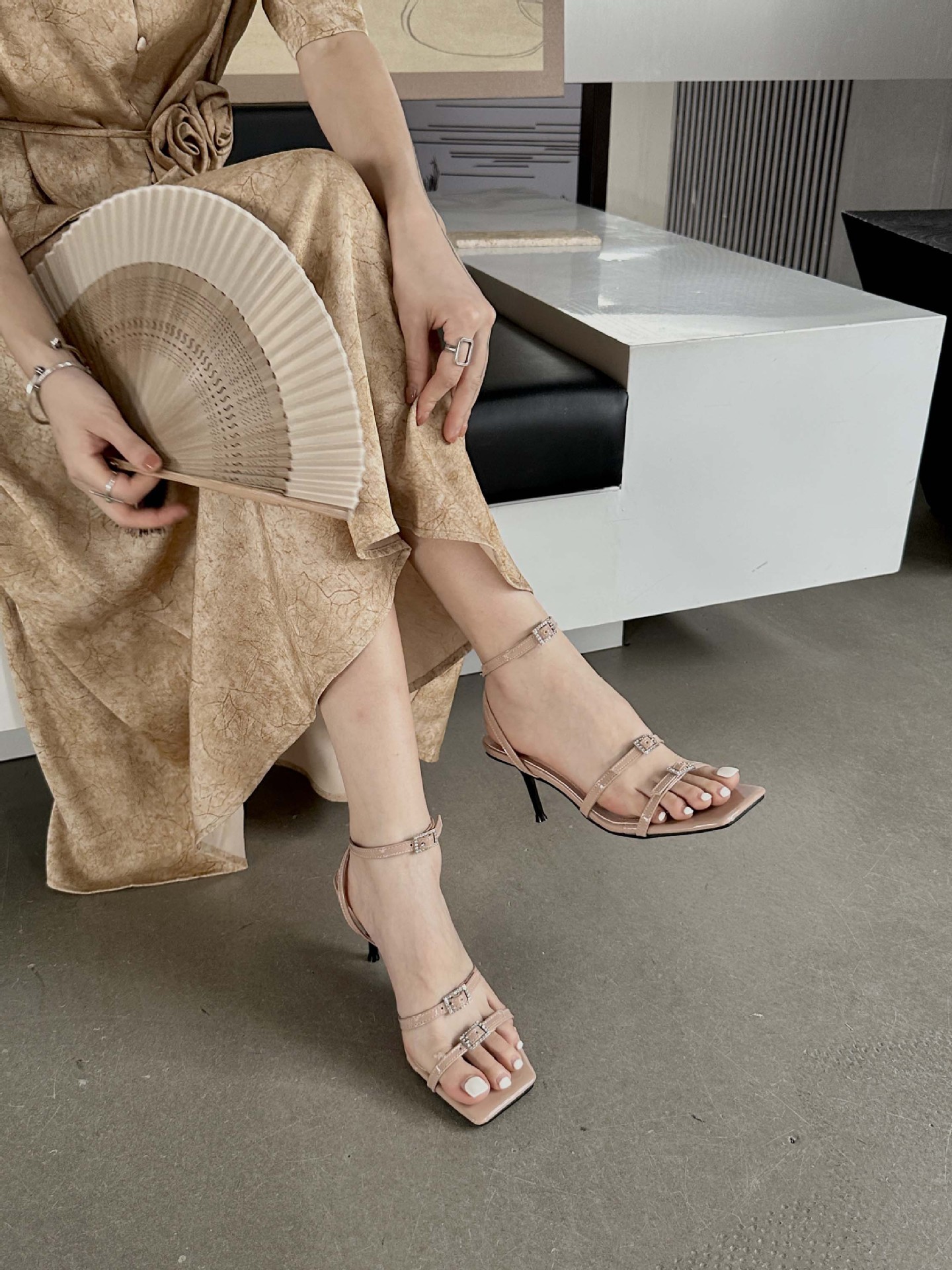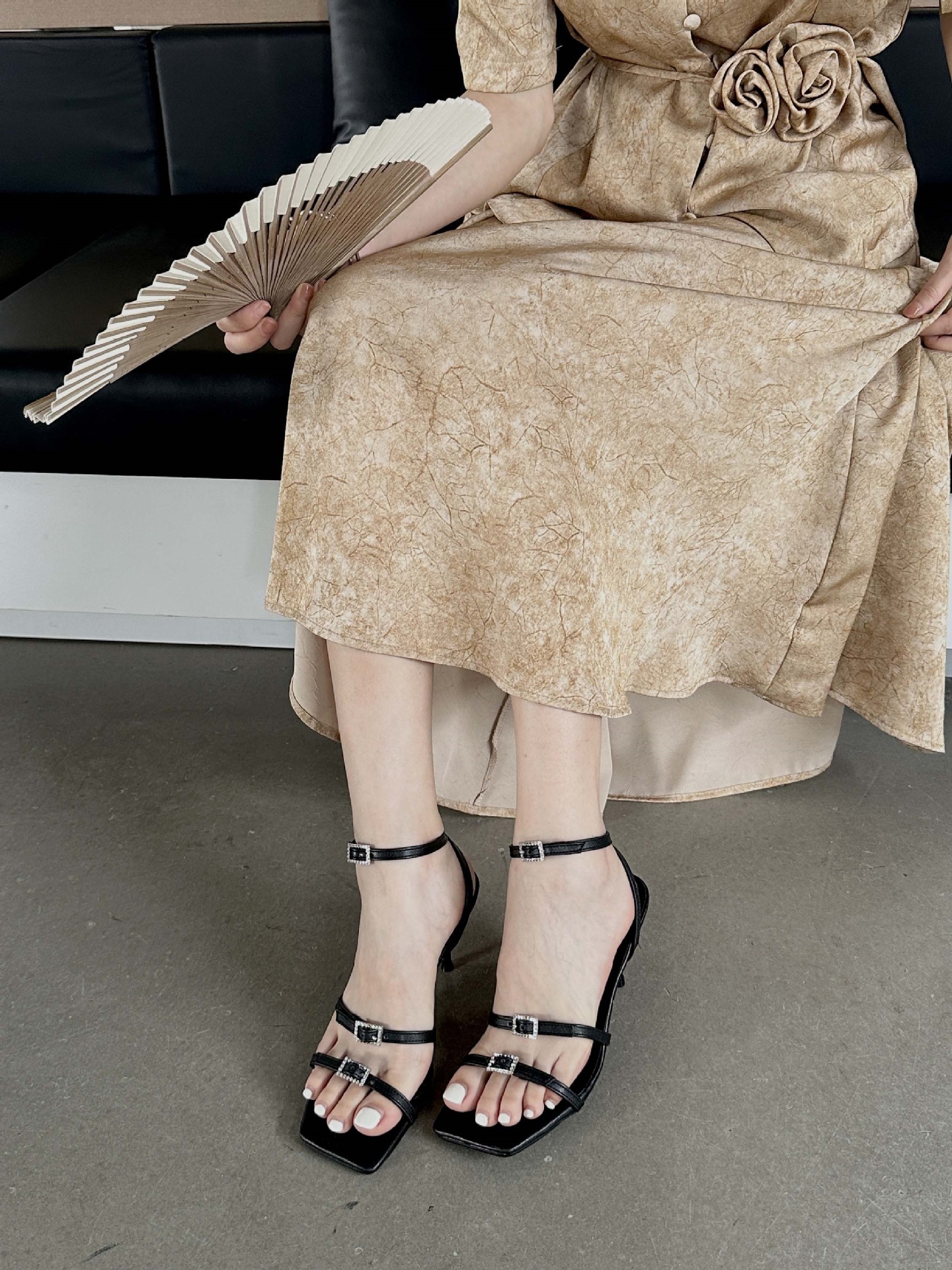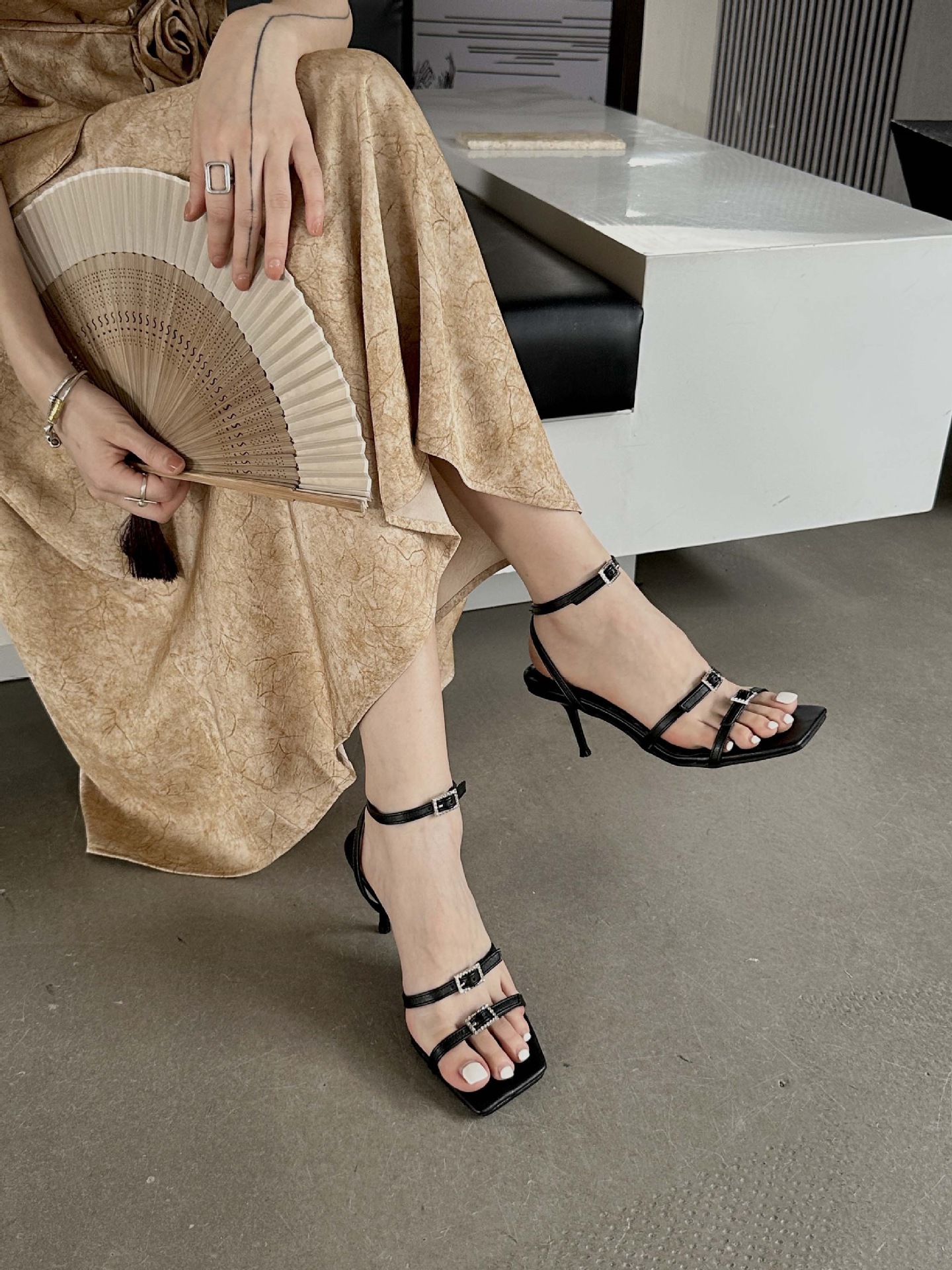 하이힐 여자 2025 년 여름 오픈 토 라인스톤 버클 스트랩 여성 신발 스틸레토 힐 로마 스타일 블랙 섹시 샌들스토어 가기