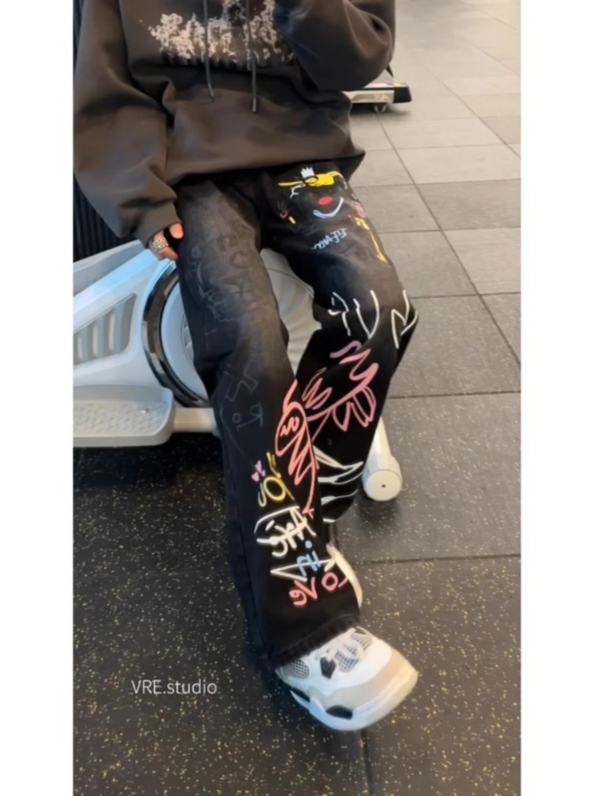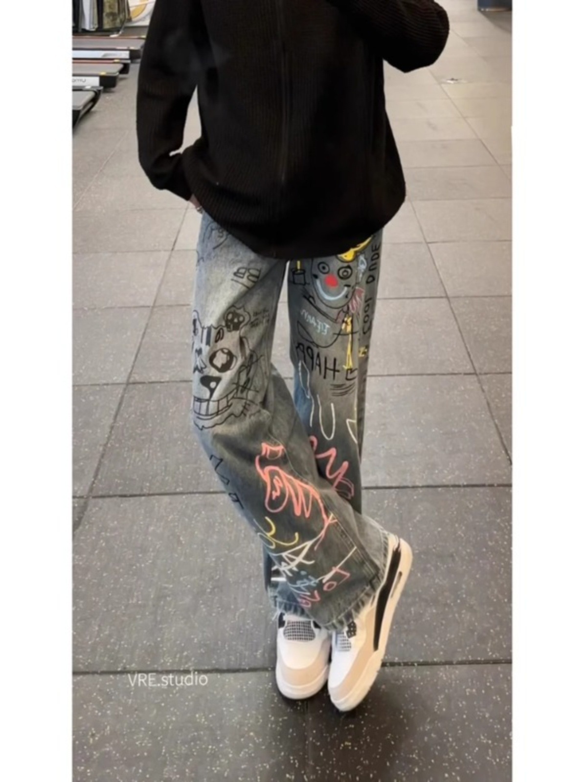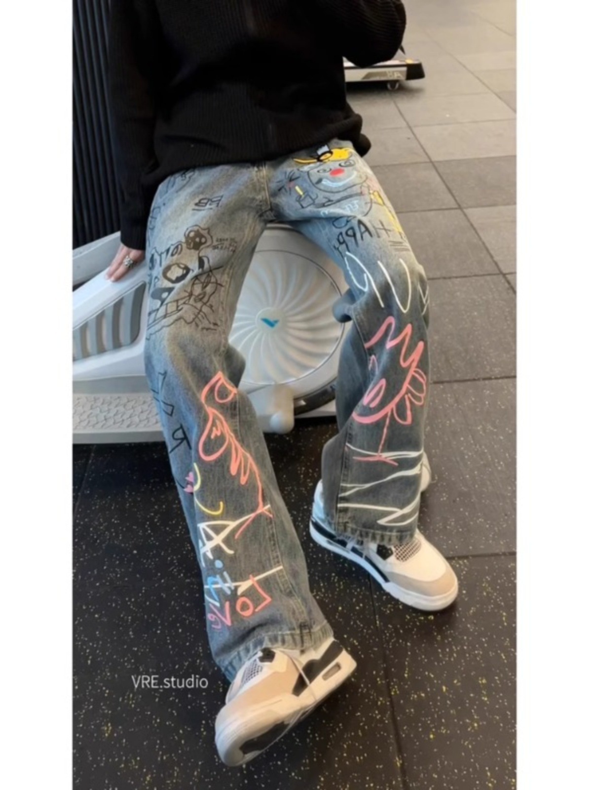 미국식 하이 스트리트 그래피티 청바지 남성 봄과 가을 할로윈 착용 바지 디자인 센스 슬리밍 스트레이트 바지스토어 가기