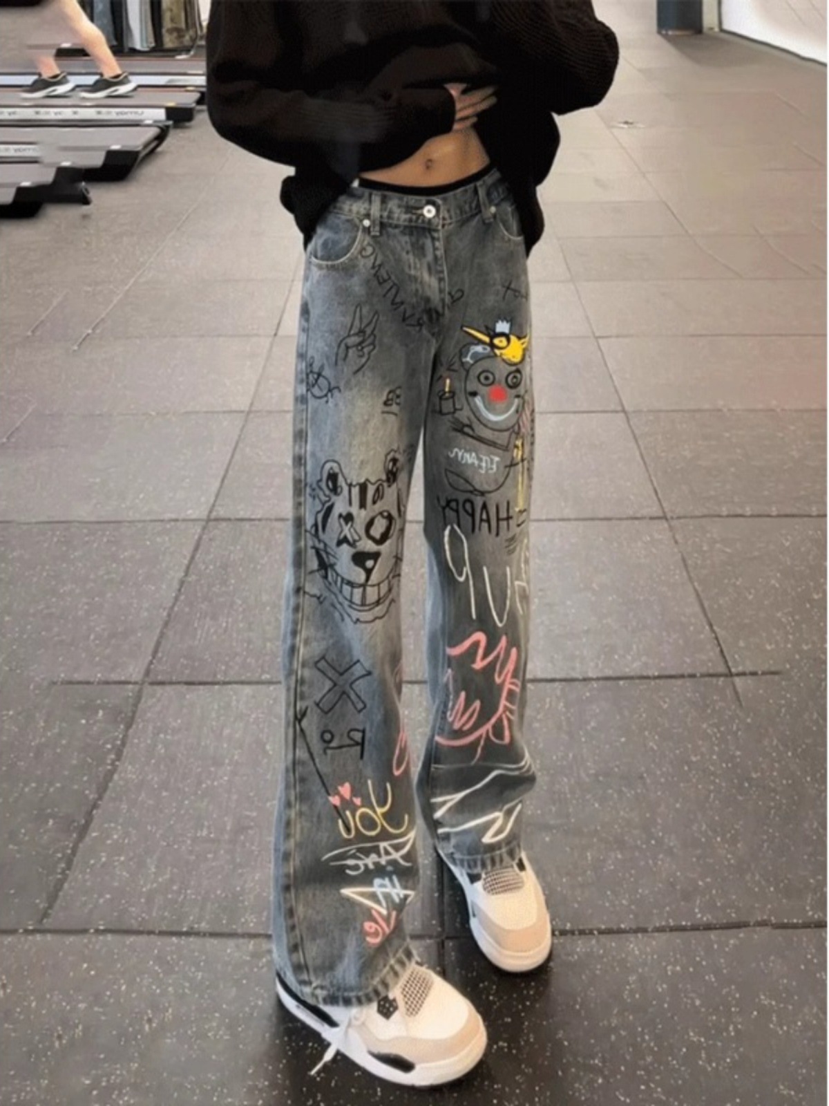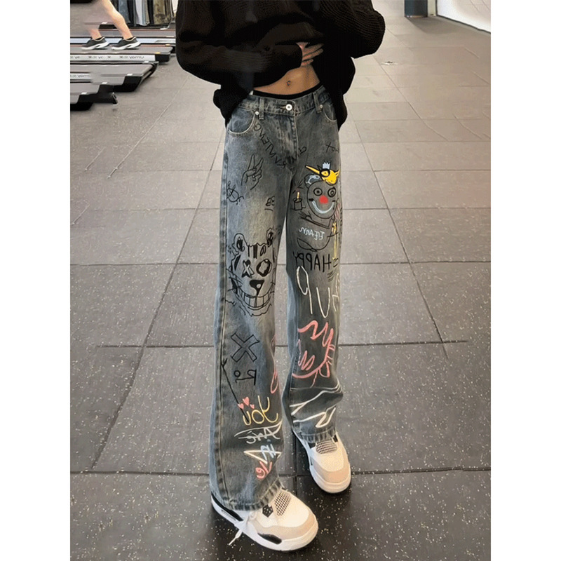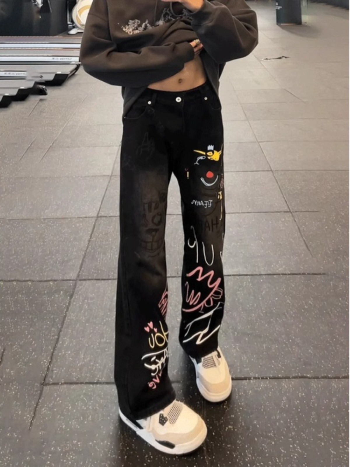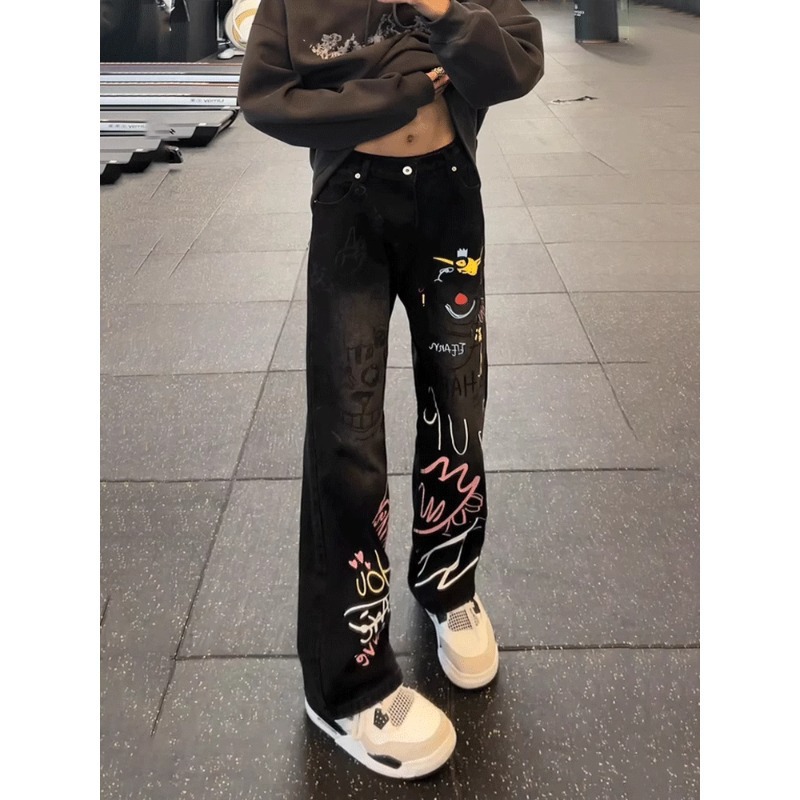 미국식 하이 스트리트 그래피티 청바지 남성 봄과 가을 할로윈 착용 바지 디자인 센스 슬리밍 스트레이트 바지스토어 가기