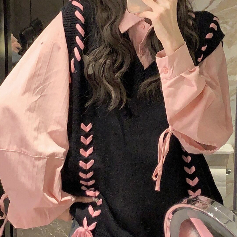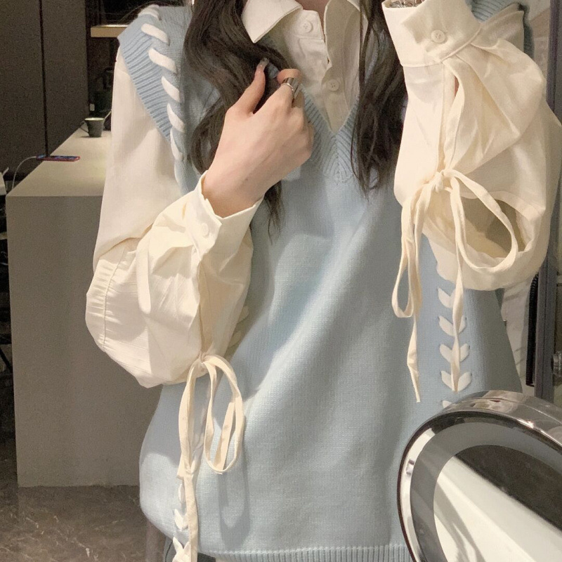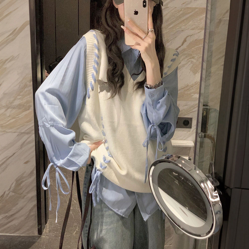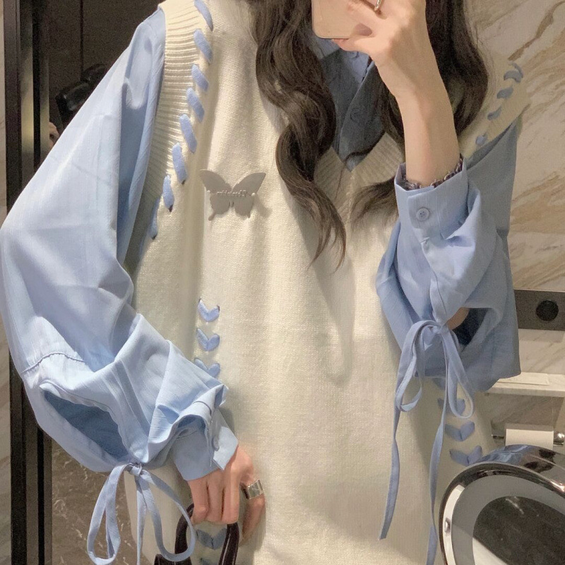 투피스 세트 한국식 캠퍼스 나비 스트랩 니트 조끼 스웨터 소녀 학생 스트랩 셔츠스토어 가기