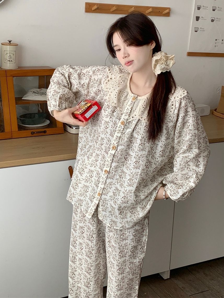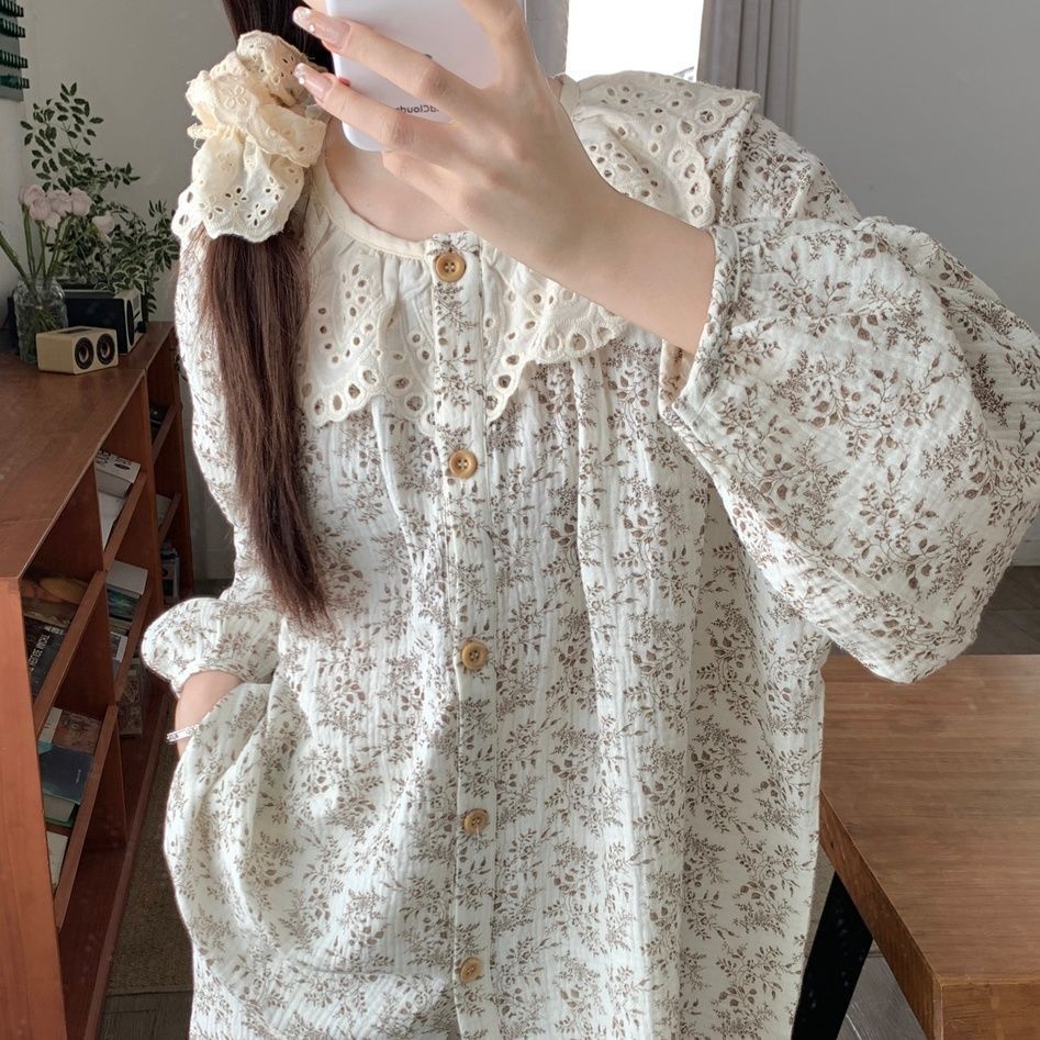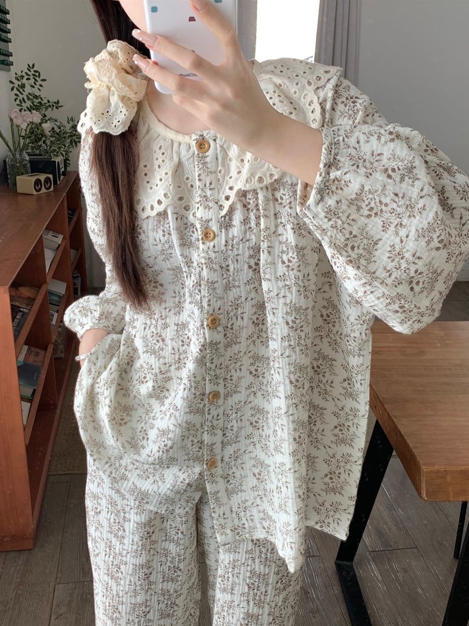 레이스 크루 넥 잠옷 여성의 봄과 가을 새로운 봄과 가을 높은 가치의 꽃 카디건 긴팔 세트 복장스토어 가기