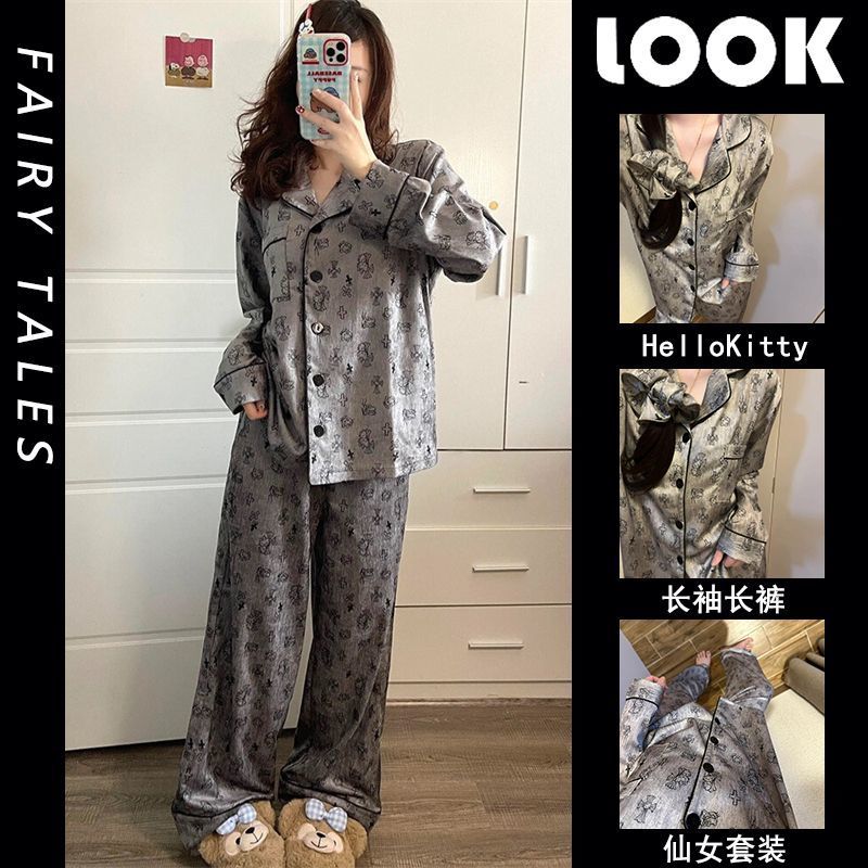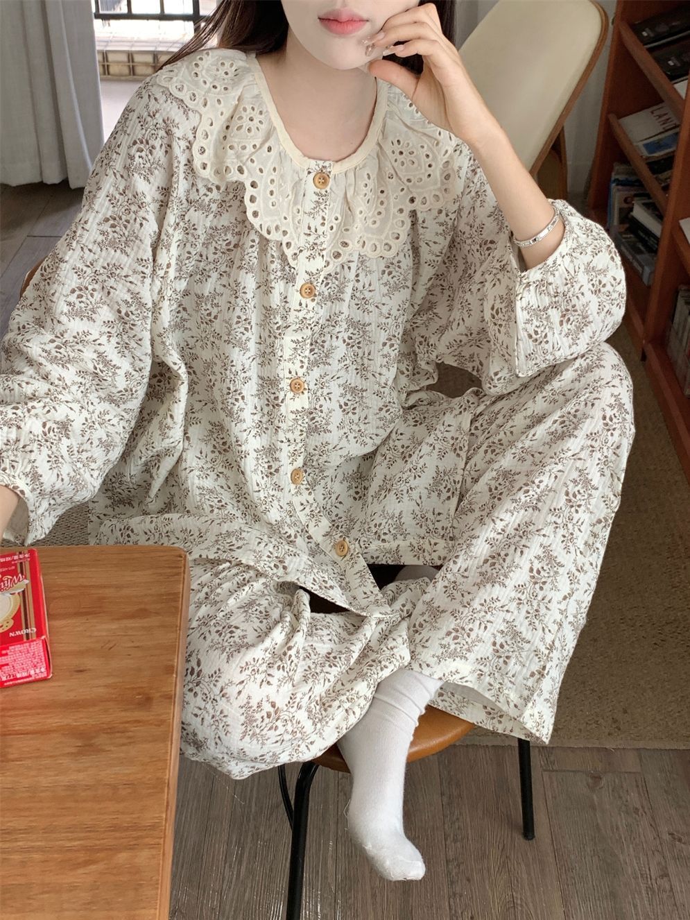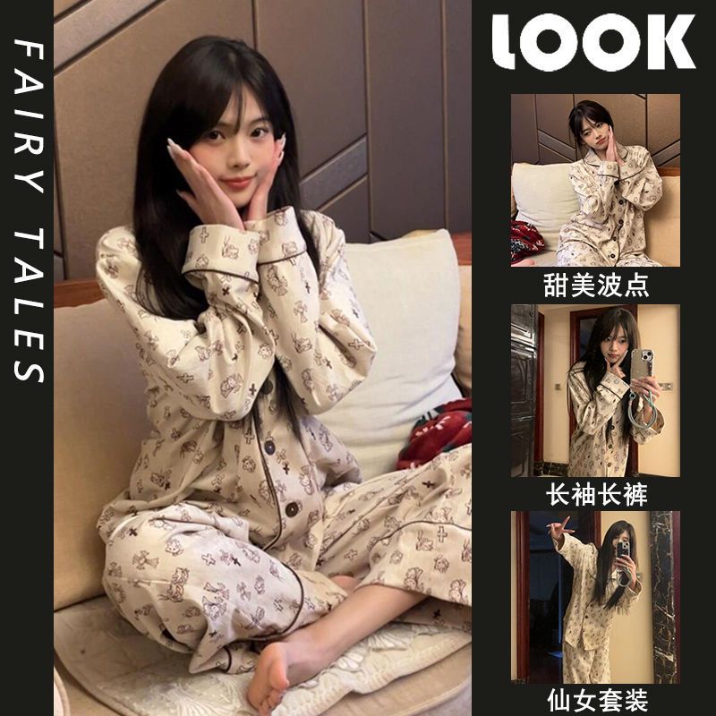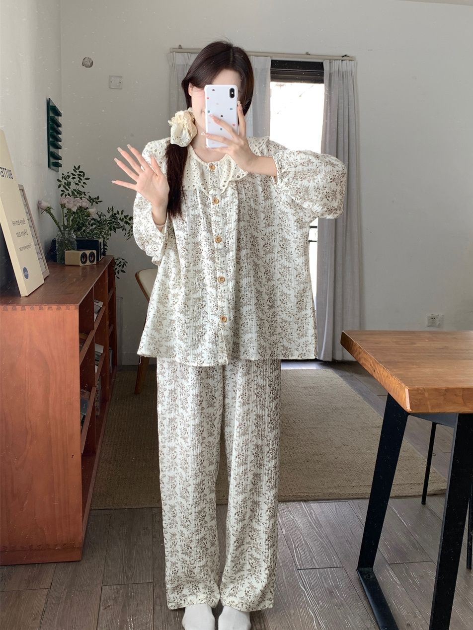레이스 크루 넥 잠옷 여성의 봄과 가을 새로운 봄과 가을 높은 가치의 꽃 카디건 긴팔 세트 복장스토어 가기
