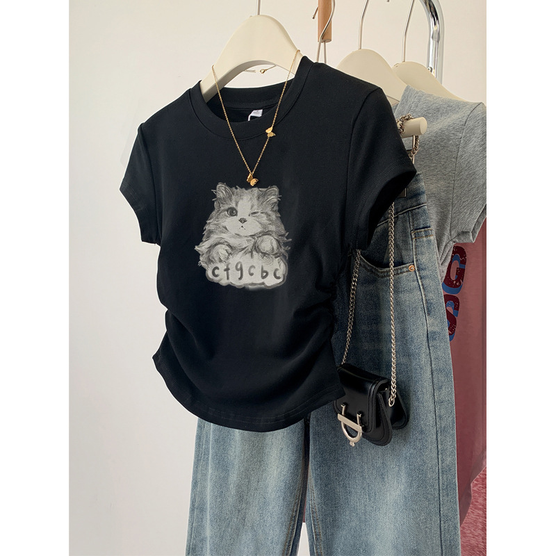 통통녀 플러스 사이즈 여성의 여름 유행 서양식 하이 엔드 디자인 허리 슬리밍 반팔 티셔츠 탑스토어 가기