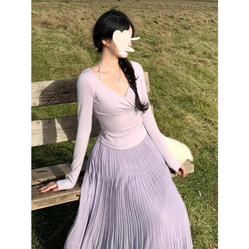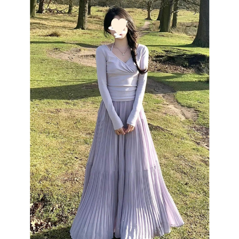 2025 퍼플 넥 탑 니트 셔츠 반쪽 치마 세트 여성 봄 한국 스타일 부드러운 주름 치마