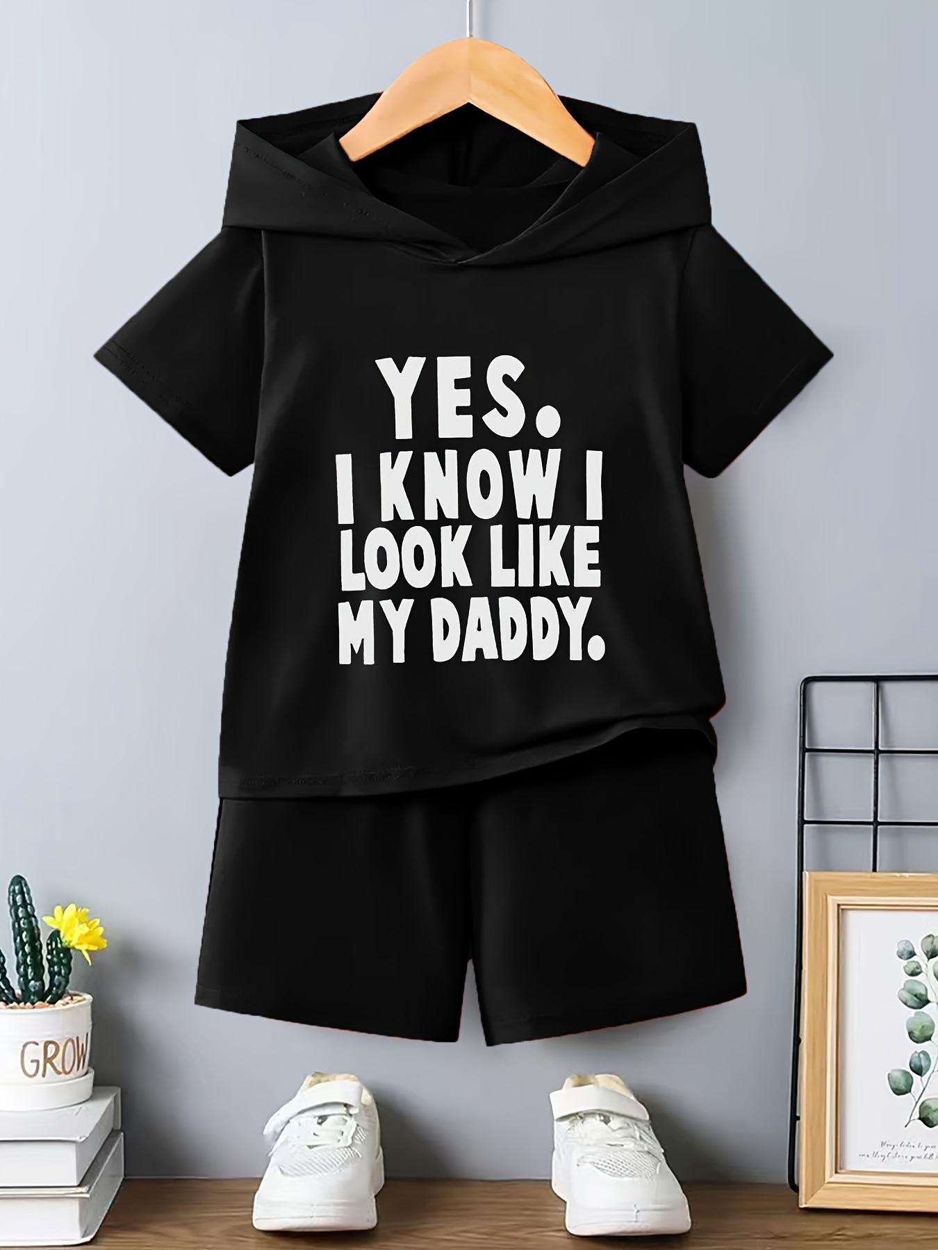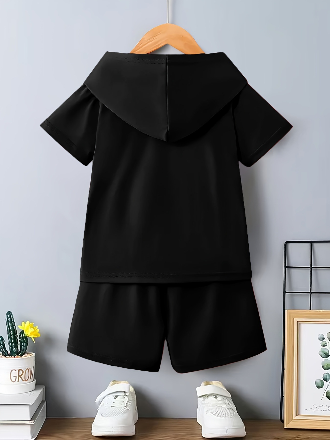 소년의 투피스 캐주얼 세트 블랙 후드 모노그램 인쇄 다목적 반팔 티셔츠와 반바지